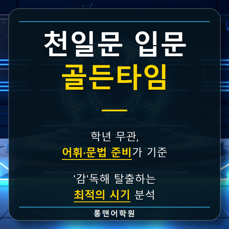 도입부: '감(感)'으로 읽는 영어의 한계점 초등 영어에서 중등·고등 영어로 넘어가는 과정에서 많은 학생들이 성적 정체기를 겪습니다. 가장 큰 원인은 단어를 조합해 대충 의미를 유추하는 '감독해(Intuitive Reading)'의 습관 때문입니다. 문장이 짧고 구조가 단순한 초등 레벨에서는 이 방식이 통하지만, 한 문장이 3~4줄에 달하는 고등 지문에서는 통하지 않습니다. 이때 필요한 것이 문장의 뼈대를 파악하는 '구문 독해(Syntax Reading)'입니다. 스테디셀러인 '천일문 입문'과 같은 구문 교재를 통해 정확한 해석의 기틀을 마련해야 하는 시점과 조건에 대해 분석합니다. 구문 독해 진입을 위한 필....... <img src="https://blogthumb.pstatic.net/MjAyNjAyMDlfNTMg/MDAxNzcwNjI4Nzc5Mzgw.WXO2ljznb379oh_uY9X82tGod2E3TkyMep0M6fzSDjAg.adYjsCad2FAeNfbrn--Mjr4UImYsIqr9NgAKCz0n2WEg.PNG/slide_final_0.png?type=s3" />