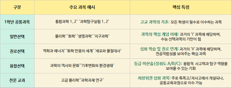 새로운 과학 교과 과정, 무엇이 어떻게 바뀌었을까요? 새로운 과학 교과 과정, 무엇이 어떻게 바뀌었을까요? 2022 개정 교육과정과 함께 본격적인 고교학점제 시대가 열리면서, 학생 스스로 자신의 진로에 맞춰 과목을 선택하고 이수하는 과정의 중요성이 그 어느 때보다 커졌습니다. 특히 과학 교과목은 복잡하고 다양하게 세분화되어, 어떤 과목을 선택하고 이수했는지가 대입에서 전공적합성과 학업 역량을 보여주는 핵심적인 평가 요소가 될 것입니다. 대학 입학사정관은 이제 '무엇을' 배웠는지를 넘어 '왜' 그 과목을 선택했고 '어떻게' 탐구했는지를 학생부를 통해 확인하려 할 것입니다. 이 가이드는 새로....... <img src="https://blogthumb.pstatic.net/MjAyNjAzMTZfMjgy/MDAxNzczNjYzMzIxODU0.rKMv3Y5ahalq3skCWJ0aL8gjYeMWfW5jsnKRO3nNdKIg.-7naG8FBIX3oRp7dFODunErIkwNoQpSHiF8iVv6ziVwg.PNG/%B0%A2%B0%FA%B8%F1%B1%BA%C0%C7_%C6%AF%C2%A1.png?type=s3" />