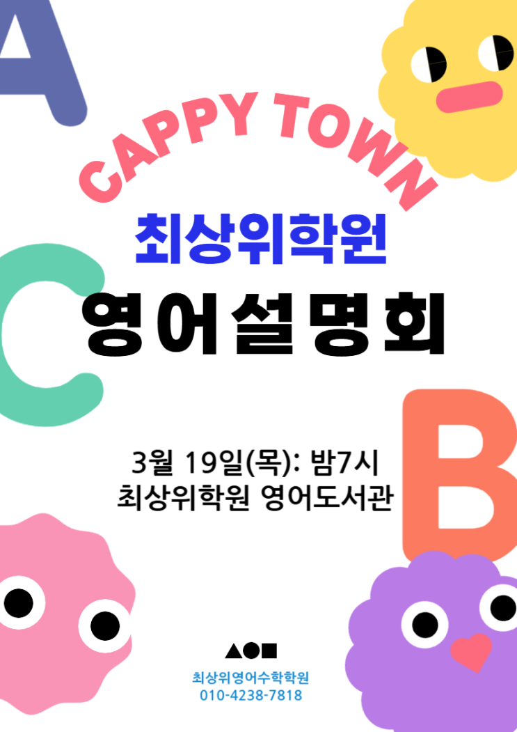 안녕하세요, 최상의학원입니다. 새 학기를 앞두고 우리 아이 영어 교육에 대해 고민이 많으실 학부모님들을 위해, 매년 뜨거운 성원 속에 진행되는 **'캐피타운 영어 설명회'** 를 개최합니다. 단순히 단어를 외우고 문법을 익히는 영어를 넘어, 아이들이 스스로 몰입하고 즐거워하는 영어의 비결이 무엇인지 직접 확인해 보세요. 영어를 처음 접할 때 가장 중요한 것은 **'거부감 없는 노출'** **'흥미'** 입니다. 캐피타운은 아이들의 눈높이에 맞춘 스토리텔링과 모국어 습득 원리를 바탕으로 설계되었습니다. 모국어 습득 방식의 자연스러운 학습: 우리말을 배울 때처럼 소리와 상황을 통해 영어를 자연스럽게....... <img src="https://blogthumb.pstatic.net/MjAyNjAzMTFfMTQg/MDAxNzczMjE5MTU3MDUz.DmGUHMFXvHW09Jji3O3fhsEgcznXVT7vmlswDTnNoDYg.pYPE15XmHkvf6Qc_M5iypiiGLv9z7NEzuYRzBfhukI0g.PNG/%C1%A6%B8%F1%C0%BB_%C0%D4%B7%C2%C7%D8%C1%D6%BC%BC%BF%E4_-001_%2811%29.png?type=s3" />