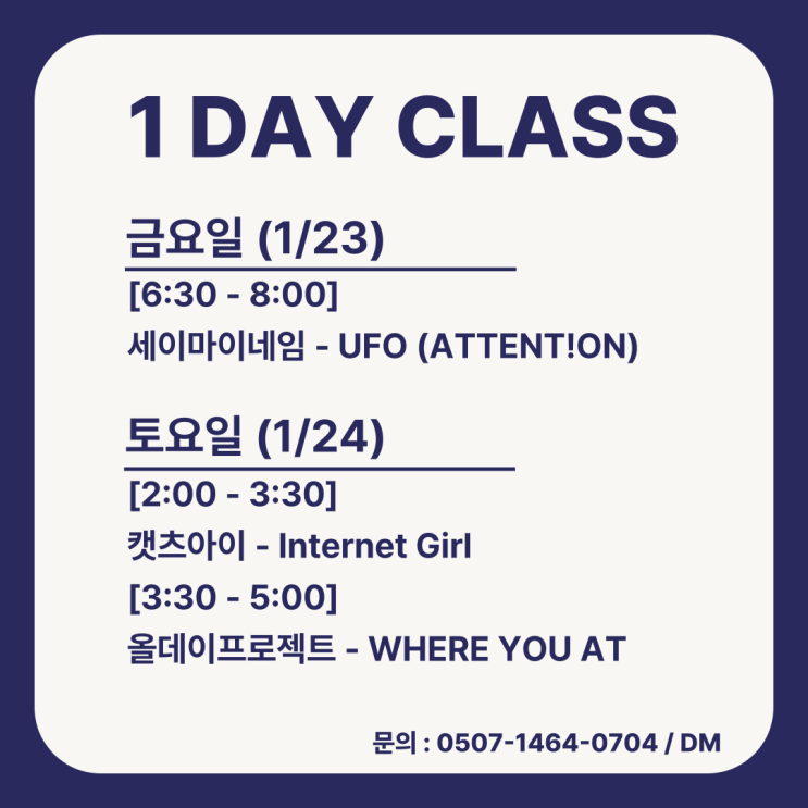 ️ 1월 넷째 주 원데이 수업 안내 안녕하세요, 아지트 뮤직댄스 학원 봉선점입니다 :) 새해를 맞이하여 학원 수업 일정 안내드립니다. 1월 넷째 주에는 특별 원데이 수업이 진행됩니다! 하루 동안 부담 없이 참여하실 수 있는 원데이 클래스로, 새해를 활기차게 이어가고 싶은 분들께 추천드려요 ✨ 또한, 1월 넷째 주 정규 수업은 모두 정상적으로 진행되오니 기존 수강생분들께서는 평소와 동일하게 수업 참여해 주시면 됩니다. 바쁜 일상 속에서도 항상 저희 학원에 관심 가져주시고 찾아주셔서 진심으로 감사드립니다. 원데이 수업을 통해 새로운 에너지를 채우고, 정규 수업에서는 더욱 즐겁고 집중도 높은 시간으로 함께해요 ....... <img src="https://blogthumb.pstatic.net/MjAyNjAxMTlfMjY3/MDAxNzY4ODAwMzgyNDg0.hul9gKF1Q_GJLBmQEbSp5geLJDiECQdC42Mqt7gSEwMg.mLlC0_s7UEjgXjfpceyEuAc-0IUOMpLvIksnQyHgLYog.PNG/001.png?type=s3" />