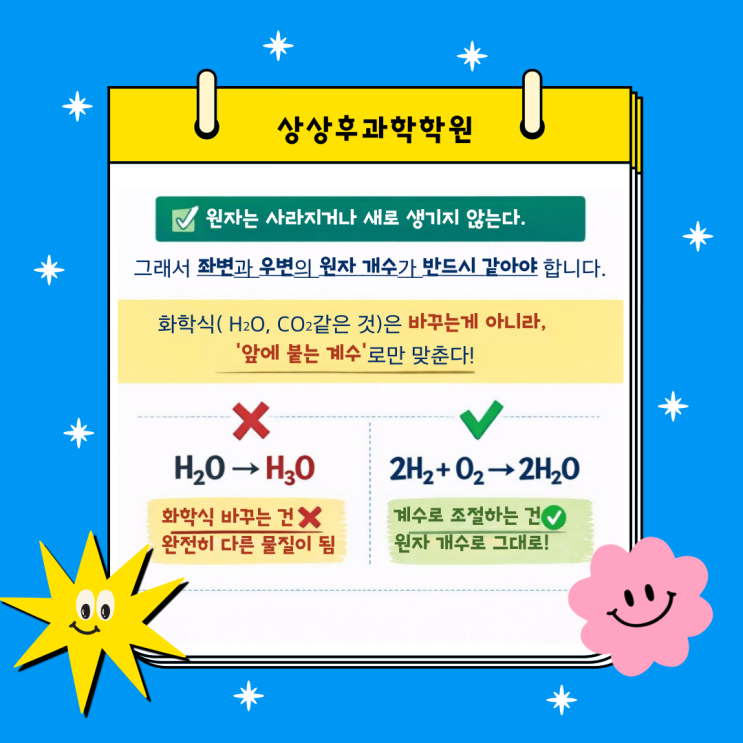 1) 화학반응식은 계산보다 먼저 “이게 무슨 뜻인지 읽는 힘”이 필요합니다. H₂ + O₂ → H₂O 이걸 보고 “수소와 산소가 만나 물이 된다”로 해석 못 하면 그 다음 단계가 진행이 안 됩니다. 2) 숫자(계수/아래 첨자)가 헷갈려서 멘붕 아래 첨자(₂)는 원자 개수 앞 계수(2H₂)는 분자 개수 3) 화학반응식은 결국 한 줄 요약하면 원자는 사라지거나 새로 생기지 않는다! 그래서 좌변과 우변의 원자 개수가 반드시 같아야 합니다. 여기서 학생들이 가장 많이 헷갈리는 게 바로 이 부분이에요. 화학식(H₂O, CO₂ 같은 것)은 바꾸는 게 아니라, “앞에 붙는 계수”로만 맞춘다는 개념입니다. H₂O를 H₃O로 바꾸는 건 ❌ (완전히 다른 물질이 됨....... <img src="https://blogthumb.pstatic.net/MjAyNjAxMjJfMTc4/MDAxNzY5MDc2NjkxODMy.uPIeB4RrG2D-W0ANKogQMWITOdldHD-iimJLH7aC_-kg.rO_lqhfZMTeBfZBSod_MnkSoOxDfkE6lcPBCno5_M14g.PNG/%C8%AD%C7%D0_%B9%DD%C0%C0.png?type=s3" />