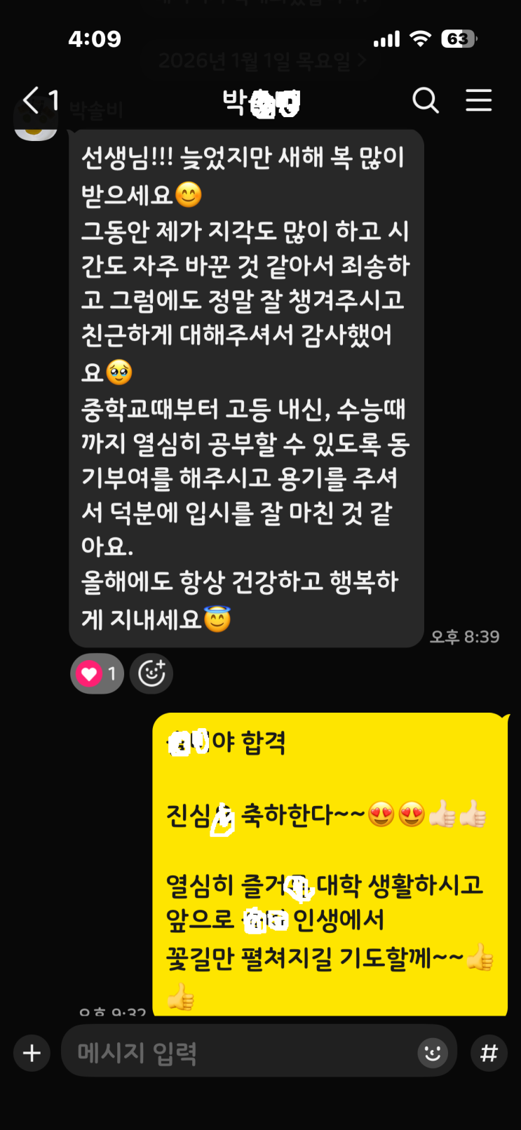 중등과 고등 총 4년을 같이한 학생이 좋은 성적을 거둬서 행복했습니다. 합격후 학생이 보내온 문자입니다. 연세대학교 공과대학, 원광대 치의예과, 조선대 의예과 3곳을 합격했습니다. 최종적으로 조선대 의예과로 결정했습니다. 학생 앞길에 행운이 가득하길 기도합니다 ~ <img src="https://blogthumb.pstatic.net/MjAyNjAxMDNfMjU4/MDAxNzY3NDE5ODM1NTEx.L-Ovv48eQqhZ74229X4YvNxSNkQDyg1OX_ilAnUoTI8g.IpemZ6-CppXePT6TgODCjk_efkWkVIx_br77XEhNfN8g.PNG/%B9%DA%BC%D6%BA%F1_%B9%AE%C0%DA_%BC%F6%C1%A4.png?type=s3" />