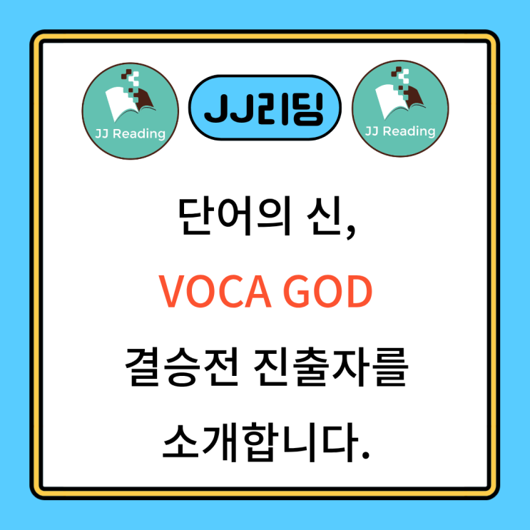 2월, 단어의 신을 가린다! 2026 보카갓(Voca God) 본선 진출자 발표 안녕하세요. 제이제이리딩 어학원 원장 Jean tr. 입니다. 진월동 영어학원 제이제이리딩 어학원의 중등레벨 학생들이 가장 긴장하면서도 가장 열정적으로 준비하는 대회, ✨ 보카갓(Voca God) ✨ 드디어 이번 달 본선 진출자 명단이 확정되었습니다! 보카갓은 단순 암기가 아닌 ✔️ 정확한 단어 의미 이해 ✔️ 스펠링 정확도 ✔️ 실제 학습 태도와 꾸준함 을 모두 평가하는 제이제이리딩 영어학원의 대표 어휘 챌린지 대회입니다. 레벨별 보카갓 본선 진출자 명단 PV 5 김O준(Noel) / 위O이(Chloe) 김O현(Angela) / 이O진(Jin) 류O서(James) / 임O리(Ha....... <img src="https://blogthumb.pstatic.net/MjAyNjAyMTJfOTkg/MDAxNzcwODkyOTQ0NDcz.s4I2xnaWD8_KHW-dx_AOQW8XxD5QTR-J__vPKi0GXRIg.6e4oSbG8zYYK1kn77ItmfBZfGR56A9Leh2Fg_73__2Qg.PNG/%C1%A6%B8%F1%C0%BB_%C0%D4%B7%C2%C7%D8%C1%D6%BC%BC%BF%E4._%283%29.png?type=s3" />