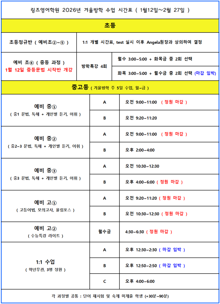 [진월동영어학원]링즈영어학원 겨울방학 시간표