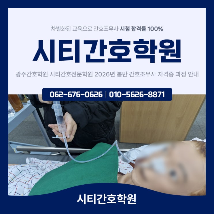 시티간호전문학원 <2026년 봄반 간호조무사 자격증 과정 안내> 안녕하세요. 광주 지역에서 간호조무사 교육 과정을 체계적으로 운영하고 있는 시티간호전문학원입니다. 광주간호학원 시티간호전문학원에서는 2026년 3월 10일, 간호조무사 자격증 과정 봄반 개강을 앞두고 과정 전반에 대한 안내와 함께 수강을 고민하시는 분들께 도움이 될 수 있는 정보를 정리해 드리고자 합니다. 현재 경력 단절 이후 재취업을 고민하고 계시거나, 안정적인 자격증 취득을 통해 새로운 진로를 계획하고 계신 분들 사이에서 간호조무사 자격증 과정에 대한 관심이 꾸준히 이어지고 있습니다. 광주간호학원 시티간호전문학원에서는 내일배움카드 발급을 통....... <img src="https://blogthumb.pstatic.net/MjAyNjAxMDhfMTcy/MDAxNzY3ODU4Njk1MDM4.os87SunqKT_H8jpPQ97_jmK0J4m-Kp3l2kJm-M0HRAYg.6cX1yeK8k4a77LSoGqzHU6dRI6x7Mkn9h24ujaMeYAIg.JPEG/%B1%A4%C1%D6%BD%C3%C6%BC%B0%A3%C8%A3%C7%D0%BF%F8-%BD%E6%B3%D7%C0%CF.jpg?type=s3" />