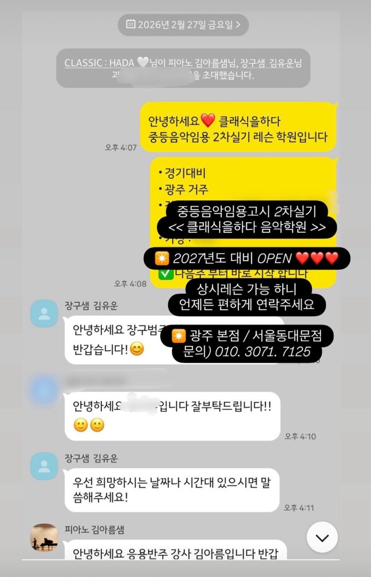 중등음악임용고시 전과목 2차 실기레슨 학원 • 광주 본점 / 서울 동대문점 ➡️ 수업문의 : 010.3071.7125 ✴️ 2026년도 광주 수석 배출‼️ ✴️ 2026년도 광주 최종티오 2명 , 전원 배출‼️ ✴️ 2026년도 전남 최종티오 7명, 4명 배출 ‼️ ✴️ 2026년도 기준, 누적 최종합격자 78명 ‼️ • 대면 / 비대면 레슨 전문 • 믿고 배우실 수 있는 임용실기전문학원 • 수업 후, 영상 녹음등 다양한 피드백 제공 • 임용 강사진 석사 • 박사 출신 전문강사 안녕하세요 ❤️ 중등음악임용고시 2차실기 전문 광주본점 / 서울동대문점 운영중인 클래식을 : 하다 입니다 #중등음악임용고시2차실기레슨 #광주서울중등음악임용고시실기레슨 본격적인....... <img src="https://blogthumb.pstatic.net/MjAyNjAyMjhfMjQz/MDAxNzcyMjQ3ODk2Mzc4.qHtiGSA8B0gGAZsQSu8s1sSUABD72XMLI4b95OXm5jIg.xpYaVJmFZUZkyvEiGeJWK6mCW-pREoi9YWzfYnh-UI0g.JPEG/IMG%A3%DF5482.jpg?type=s3" />