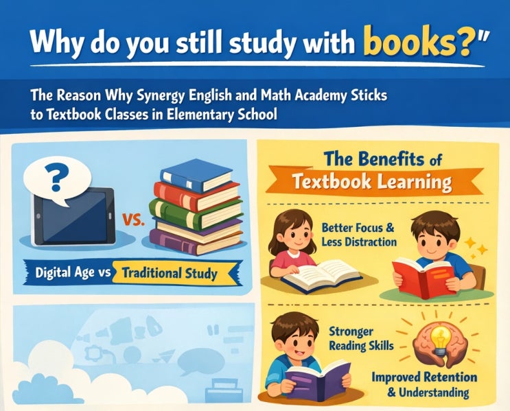 “왜 아직도 책으로 공부하나요?” — 시너지영어수학학원이 초등부에서 패드보다 교재 수업을 고수하는 이유 요즘 초등 학부모님들께 상담을 드리다 보면, “요즘 시대에 패드로 배우는 게 더 빠르지 않을까요?” 라는 질문을 자주 듣습니다. 맞습니다. 세상은 디지털 시대로 빠르게 바뀌고 있고, 아이들도 태어날 때부터 스마트기기와 함께 자라는 세대죠. 하지만 영어 학습만큼은, 특히 초등 저·중학년에서는 ‘교재 기반의 학습’이 훨씬 강력한 효과를 발휘합니다. 오늘은 시너지영어수학학원이 베스트셀러 초등 영어교재 ‘능률 옐로우 시리즈’로 꾸준히 지도하는 이유를 차근차근 안내해드릴게요. 1. 패드 학습이 편리해 보여....... <img src="https://blogthumb.pstatic.net/MjAyNjAyMTBfMTUg/MDAxNzcwNjg5NTM1Mjc4.3HIomEXMgnCsC8teonxuS74mCo50N5-l42f0ySrrgjYg.J_zRzVV3wIIEjzzDU-kKf6B51zb20IDcg-oFmWzjqMEg.JPEG/%B5%F0%C1%F6%C5%D0%BA%CF.jpg?type=s3" />