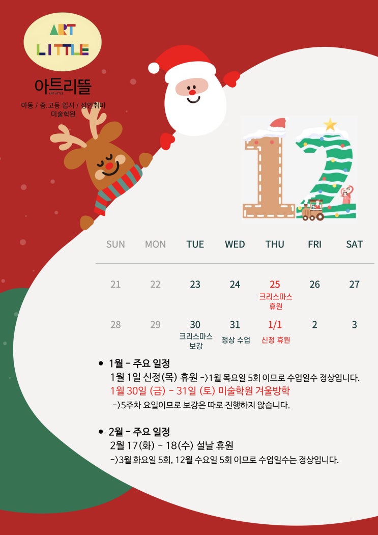 광주아동미술학원 광주미술학원 광주성인취미 첨단입시미술 신용동입시미술 첨단2지구미술학원 첨단미술학원 신용동미술학원 광주건국초 광주신용초 광주북구미술학원 안녕하세요 아트리뜰 미술학원입니다 ! 크리스마스 잘 보내셨나요 ~? 1월 방학도 알릴 겸, 12월 캘린더 올립니다 2월엔 설날연휴가 화수목으로 쉬어가기 때문에 부족한 수업일수를 12월달 말부터 채웠답니다 ^^ 수업관련 궁금하신 점 있으시면 언제든 문의주세요 ! 아트리뜰 미술학원 수강문의 010 - 6565 - 6833 <img src="https://blogthumb.pstatic.net/MjAyNjAxMjBfNDIg/MDAxNzY4OTA1MTk2NTUy.s7u_5UGrFzmMKlp4jHXRMX-ZolD5a3JJhY-Zd2hjAgsg.svnYKmaMidWaDBkZMb9ul2t5bNeIXWAJBkEpMEIolbQg.JPEG/202512%BF%F9%BE%C8%B3%BB%B9%AE.jpg?type=s3" />
