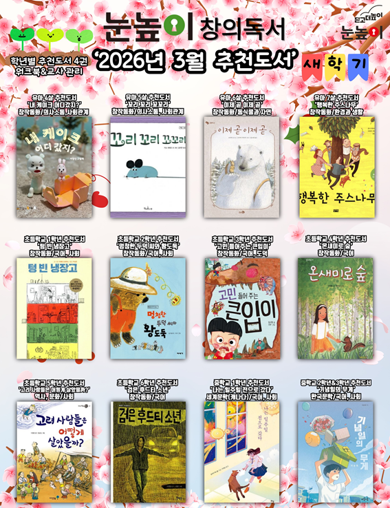 새학기, 우리 아이 독서습관부터 시작하세요 3월은 새로운 학년이 시작되는 새학기의 출발점입니다. 어떤 책을 읽느냐에 따라 아이들의 문해력, 사고력, 상상력이 크게 달라질 수 있습니다. 학년별 발달단계에 맞춘 **‘눈높이 창의독서 3월 추천도서’**를 선정하여 아이들이 즐겁게 독서를 시작할 수 있도록 안내하고 있습니다. 오늘은 2026년 3월 눈높이 창의독서 추천도서를 소개해 드리겠습니다. 유아 추천도서 내 케이크 어디 갔지? 유아들이 좋아하는 이야기 형식으로 구성된 그림책입니다. 아이들이 자연스럽게 관찰력과 추리력을 키울 수 있습니다. 꼬리 꼬리 꼬꼬리 반복되는 문장과 귀여운 그림을 통해 아이들이 언어....... <img src="https://blogthumb.pstatic.net/MjAyNjAzMDZfMjgg/MDAxNzcyNzgzNzk3NjQ0.nMvmiTy3PXogZ5MLXrSQo9yUi4o9JDRrALKiDlQ1j5sg.ORPyS4PV9aBf3g1HZUCZId69AoUOuDlAe6Rx9uekU44g.PNG/image.png?type=s3" />