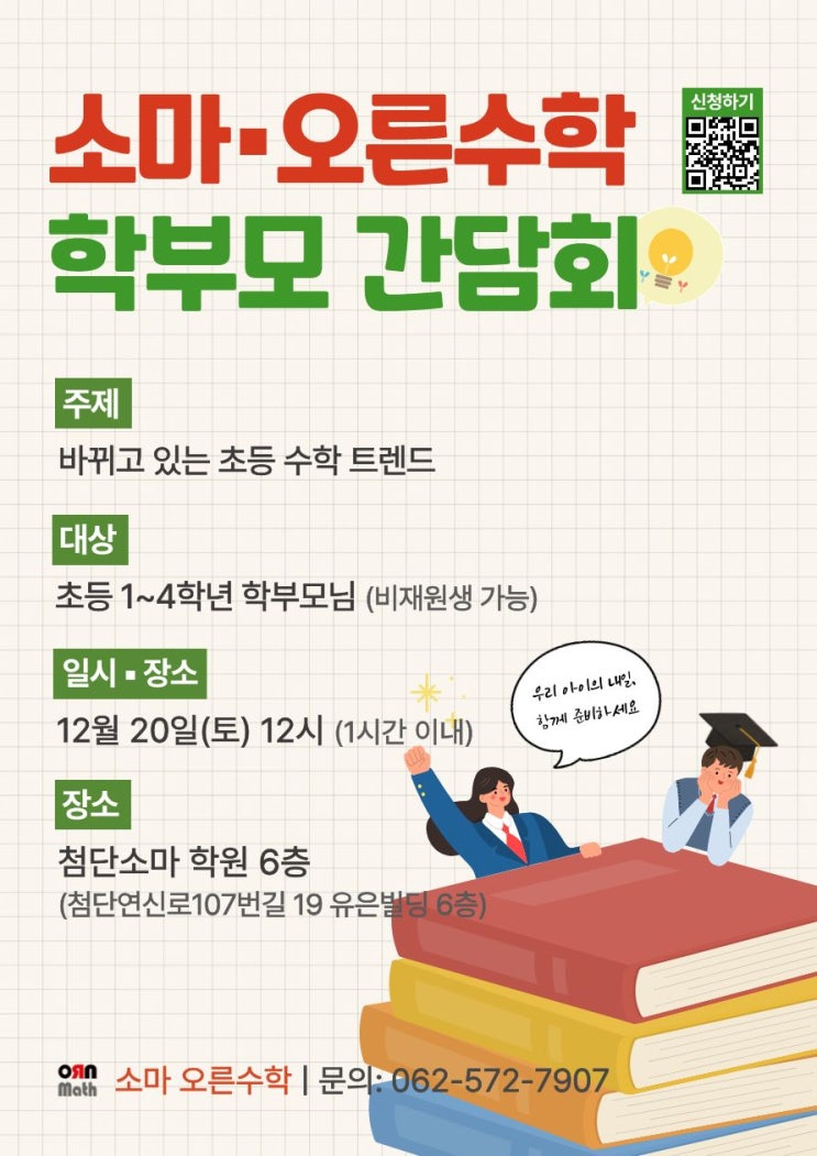 ⭕️ 소마 사고력 설명회 안내 아이들을 어떻게 지도하면 좋을 지, 최근 초등수학 교육은 어떤 지 궁금하신 학부모님들을 위해 간단한 간담회를 준비했습니다 이번 설명회에서는.. • 소마 사고력 및 교과 수업 소개 • 단계별 커리큘럼 • 실제 수업 활동 예시 • 아이들이 얻는 학습 효과 등을 짧고 명확하게 안내드릴 예정입니다. 참여방법은 신청 폼에 성함 / 연락처 / 자녀 학년 / 참석 여부를 적어주면 됩니다. ↓참여신청 바로가기↓ 방학 전, 우리 아이에게 맞는 학습 방향을 확인할 수 있는 좋은 시간이 될 거예요. 많은 관심 부탁드립니다^^ (소마오른수학 첨단점/062-572-7907) 개별 레벨 테스트 및 수업 상담은 학원으로 문의 주....... <img src="https://blogthumb.pstatic.net/MjAyNTEyMTBfOTYg/MDAxNzY1MzUxNDI5NDIy.lpRzmxLxGmgTczqdQJKWAgtFzWHdhi2Vfizhep5r_4sg.dfYzH4WsvYLp_RnEpmcKzzRgELu2fKJqMK03svSac8Eg.JPEG/%C1%A6%B8%F1%C0%BB_%C0%D4%B7%C2%C7%D8%C1%D6%BC%BC%BF%E4_%285%29.jpg?type=s3" />