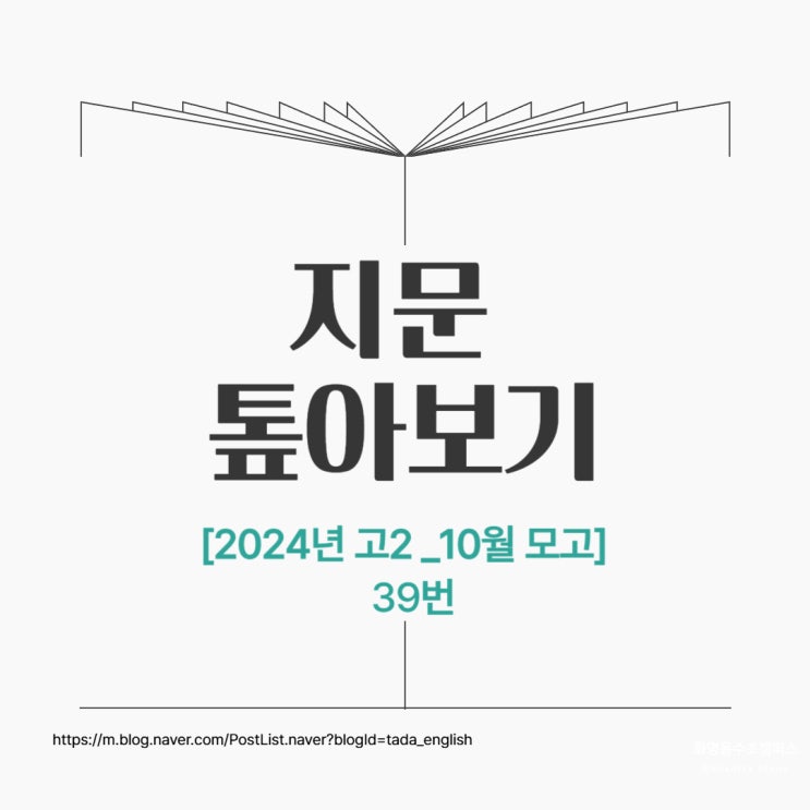 안녕하세요, 로제타스톤 영어교습소 화명 용수초 캠퍼스입니다^^ 지문 톺아보기 이번 지문은 2024년 10월 2학년 모의고사 39번 지문입니다^^ 이 포스팅은 단순히 영어 지문 을 해석하거나 문제를 푸는 데서 끝나지 않아요. 학생들이 직접 보고, 스스로 이해할 수 있도록 시각 자료와 실제 생활 속 상황을 연결해 만든 콘텐츠예요. 문장 하나, 그림 하나도 “이걸 보면 아이들이 조금 더 쉽게 이해하겠지?” 하는 마음으로 준비했답니다. 제가 바라는 건 단순한 지식 전달이 아니에요. 아이들 머릿속에 오래오래 남을 수 있는, 깊이 있는 개념을 만들어주는 것이 목표입니다. 정확한 영어 해석은 이미 해설지에 잘 정리되어 있으니, 이곳에서는 내....... <img src="https://blogthumb.pstatic.net/MjAyNTEyMDhfMjQ0/MDAxNzY1MTcwMTg4NjMw.MK-1PW4izbRs3MLB_sSHlxRSWZTx6uCUaEkjsm-SAzcg.vrCOlFoVDgnTzGkCwxuMh6A2-fALfLZSRcO9QK8HMOAg.JPEG/%C1%A6%B8%F1%C0%BB_%C0%D4%B7%C2%C7%D8%C1%D6%BC%BC%BF%E4_-002.jpg?type=s3" />