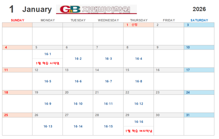 안녕하세요. 지앤비 신용캠퍼스 입니다 ^^ 2025년 우리 친구들의 성장을 지켜보며 올 한해도 친구들과 함께 한 시간이 너무 감사하고 소중했다 생각하는 요즘입니다. 한달 수업이 16일로 구성되어 있구요 마지막 학습일은 = Final Test 이므로 변동 사항 없으면 마지막 학습일은 친구들과 함께 테스트를 진행합니다 2026년 일정은 학원 사정이나 국가에서 진행되는 이슈 등에 따라 변동 가능성이 있어요~ ☆변동사항 있을시 다시 공지 드리겠습니다.☆ 그렇게 벌써 2026년이 코앞이고 겨울방학이 끝남과 동시에 1월 5일 짜짠~~ 첫 수업이 시작됩니다 (짝짝짝) 1 월은 순탄하게 16일 수업 진행하구요 아이쿠 ㅠㅠ 2월은 일수도 짧은데 긴 연....... <img src="https://blogthumb.pstatic.net/MjAyNTEyMjVfMjIz/MDAxNzY2NjIyNjIzNDY0.-RxT71K3707N0dIZ71vQYpvLIv0Kl3yB433kz7J8rw8g.WqKgUXUdwg8efNj8KBDe0xh9BvdMYSgptv1ZAl3jMmcg.PNG/image.png?type=s3" />