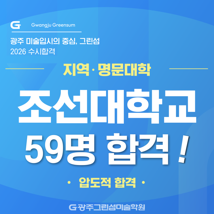 안녕하세요! 광주 북구 그린섬 미술학원입니다. 오늘! 또 하나의 반가운 소식을 전해봅니다. 이번에는 조선대학교 수시 합격 이야기입니다. 우리 광주그린섬미술학원에서는 26학년도 수시에서 59명 합격이라는 결과를 보여주었습니다. 모두 모두 축하합니다~^^ 조선대는 기본기와 표현의 안정감을 중심으로 실질적인 실력을 차분히 평가하는 전형으로, 준비 과정의 꾸준함이 중요한 학교입니다. 특히 내신과 실기의 비중 중 실기의 비중이 높기에 평소 준비가 잘되어 있어야 하는 학교이기도 합니다. 조선대학교 전형은 화려함보다는 형태 이해, 구성력, 표현의 완성도를 중점적으로 보는데요! 이번 합격 사례 역시 단기간의 무리한 변화보다는 기....... <img src="https://blogthumb.pstatic.net/MjAyNjAxMTNfMTgy/MDAxNzY4MzAzNDAyNTM0.VCe0bEE4d48Dn9j7UUUMjEI98PysC8O5PWrdw80ZMVIg.C0ggLnTA9Nj2Emg9oX3Z4Vq5uNnCxsvGZi7goP7V9X4g.PNG/KakaoTalk_Photo_2026-01-13-20-19-31_003.png?type=s3" />