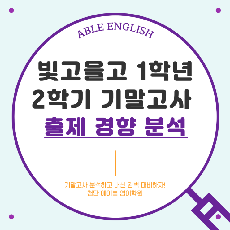 안녕하세요! 에이블 영어학원입니다. 드디어 1년 간의 시험이 모두 끝이 났습니다. 시험 기간동안 열심히 공부한 우리 에이블 학생들 모두 너무 고생 많았습니다! 기말고사가 끝났다는 건, 곧 새로운 시작이 다가온다는 뜻이기도 하죠! 이번 시험 분석을 통해 발견한 나의 부족한 점을 채워나가 보도록 해요~! ㅣ 에이블 영어와 함께, 지금 바로 Let's Go~! 빛고을고 1학년 2학기 기말고사 출제 경향 분석 배점은 객관식 78점, 주관식 22점이고, 객관식 24문항 + 주관식 6문항 총 30문항으로 구성되었어요! 시험범위는 교과서 3과, 4과 모의고사와 부교재를 활용하여 출제하였습니다! 어떤 부분에서 어떤 유형이 출제되고 각 문....... <img src="https://blogthumb.pstatic.net/MjAyNjAxMTRfNTMg/MDAxNzY4MzczNDQxMTY3.7Qk3p59v7166hid-VnxVp4BOqN-nTclaOrOaxn_uXoYg.vYpq1KBXqEpkqXrmNEH-dqvdHlbEwbuvyHJjwUzu8RIg.PNG/%BA%FB%B0%ED%C0%BB1.png?type=s3" />