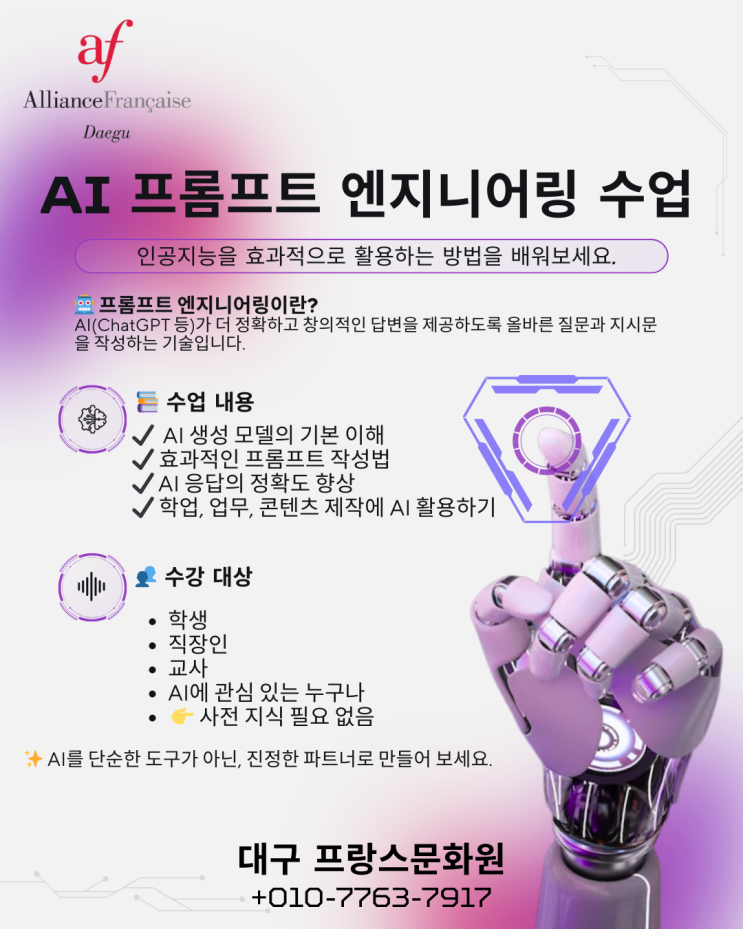 ✨ 드디어 문화원에 AI 과정이 신설되었습니다! ✨ 글쓰기의 새로운 시대, 이제 AI와 함께하는 콘텐츠 제작이 시작됩니다. 본 과정은 AI 프롬프트 엔지니어를 꿈꾸시는 분들, 네이버 블로그·콘텐츠 글쓰기에 AI를 활용하고 싶은 분들, AI를 단순 사용이 아닌 제대로 다루고 싶은 분들을 위해 준비된 과정입니다. 기초부터 실습까지, ✔️ 생성형 AI 이해 ✔️ 글쓰기용 프롬프트 구조 설계 ✔️ 실제 콘텐츠에 바로 적용 가능한 프롬프트 작성법 을 중심으로 진행됩니다. AI에게 “무엇을, 어떻게” 질문하느냐에 따라 결과는 완전히 달라집니다. 이제 AI를 쓰는 사람이 아니라, AI를 설계하는 사람이 되어보세요. 자세한 내....... <img src="https://blogthumb.pstatic.net/MjAyNjAxMTdfMSAg/MDAxNzY4NjU4NTkzNDMz.XlxaIdd5gNeJ7XkjylKqMTapF7Qpt7f-_te1WUGraUsg.yfgVswBAJ0GClCZOrmU1ASCJcvTLevBCaGgKzKUYDucg.PNG/AI_prompt_class.png?type=s3" />