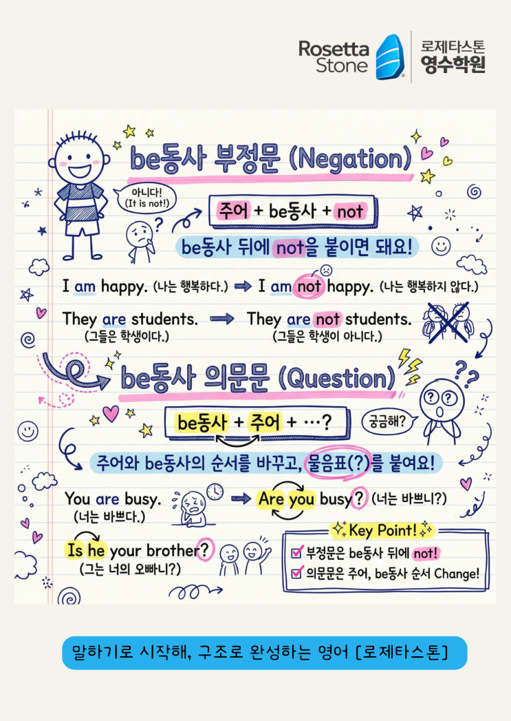신창중, 진흥중 1학년 친구들 모두 주목! — 영어의 첫 시작인 be동사, 헷갈리는 짝꿍 찾기부터 부정문, 의문문까지 , 로제타스톤이 직접 만든 귀여운 요약 노트로 한 번에 끝내봐요! 드디어 설레는 중학교 첫 학기가 시작되었네요. 특히 신창중학교와 진흥중학교에 입학한 1학년 친구들은 처음 접하는 영어 교과서와 문법 내용에 긴장도 되고 설레기도 할 거예요. 신창중 미래엔(문), 진흥중 천재(이) 1학년 영어 교과서 1단원의 가장 핵심은 뭐니 뭐니 해도 be동사죠! 시험 문제에도 빠지지 않고 등장하는 be동사, 어떻게 하면 완벽하게 내 것으로 만들 수 있을지, 귀여운 그림과 함께 기초부터 탄탄하게 정리해 볼게요. 영어의 시작, 문장의 기....... <img src="https://blogthumb.pstatic.net/MjAyNjAzMTFfODcg/MDAxNzczMjM3ODM5NTM0.Z2y6nhqVAzSMoMFHW6ZzxxP4loASHQsPSbRAszVisn4g.6Xr9U4D69akb7puD3A3Ks2v_WK0q8CFvi7zR4eSbU-Qg.PNG/%B4%DC%B6%F4_%C5%D8%BD%BA%C6%AE_%281%29.png?type=s3" />