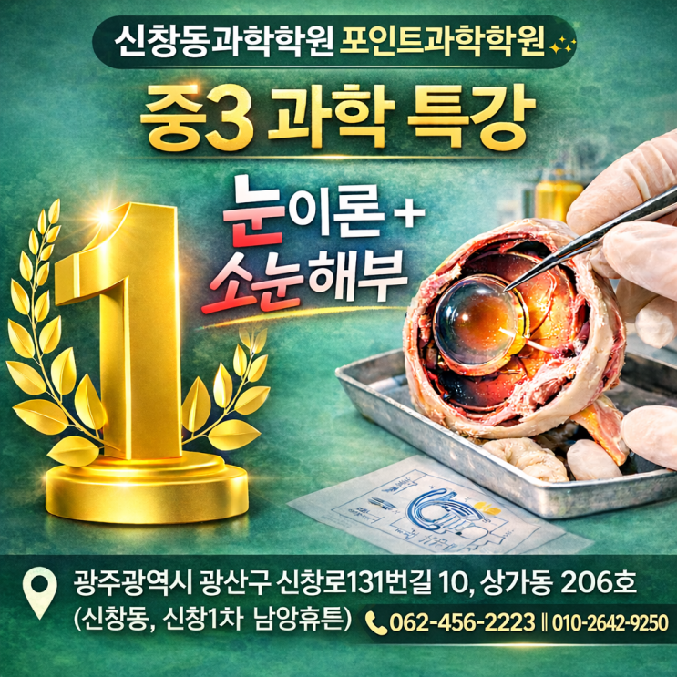 신창동과학학원 포인트과학학원 중3 과학 특강 안내! 눈의 구조와 시각의 원리 직접 확인하는 소눈 해부 실험 광산구 과학학원을 찾고 계신다면 단순히 문제만 많이 푸는 수업이 아니라 직접 보고 이해하는 과학 수업을 경험해 보시는 것이 중요합니다. 신창동과학학원 포인트과학학원에서는 중학교 3학년 과학 교과 과정 중 중요한 단원인 ‘감각기관 – 시각’을 보다 깊이 이해할 수 있도록 이론 수업과 실험을 결합한 특별 과학 특강을 준비했습니다. 교과서 속 그림과 글만으로는 눈의 구조를 완전히 이해하기 어렵습니다. 수정체, 망막, 시신경 등 눈의 각 구조가 어떤 역할을 하는지 직접 관찰해 보면 개념이 훨씬 명확해집니다. 그래서 이....... <img src="https://blogthumb.pstatic.net/MjAyNjAzMTJfMjQy/MDAxNzczMzE3OTYzNDIx.0u3Cq-sG7nmj_eKaYZzb17Gp2IJ6mHWZThQ8K1cdRFkg.JB1T8xu0H9BOqaraNdMwDs0dzddXnM-F61QX20Oh5b8g.PNG/ChatGPT_Image_2026%B3%E2_3%BF%F9_12%C0%CF_%BF%C0%C8%C4_09_16_00.png?type=s3" />