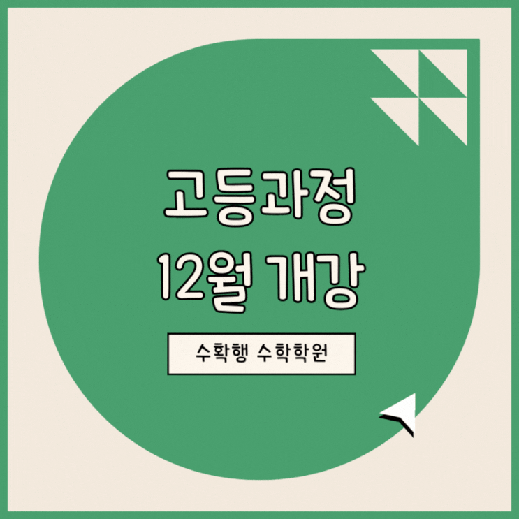 수학으로 확실한 행복을~ 수완지구 수학전문학원 수확행 수학학원입니다. 각 학교의 기말고사 및 내신과정이 마무리되며 1년을 돌아볼 때입니다. 다시 또 달려볼 2026년 및 미래를 위해 학생들의 동기가 흐려지지 않기 위해 고등학교 과정의 12월의 1차 개강 일정을 안내해드립니다. *모든 과정은 1월에 2차 개강할 예정입니다. 공통수학1 및 공통수학2 -공통수학1 문제풀이반 개강일정 12월 8일 (월/수/금 5:00-7:00) 교재 : 쎈 공통수학1 -공통수학2 개념과정반 개강일정 12월 8일 (월/수/금 5:00-7:00) 교재 : 라이트쎈 공통수학2 대수(2학년 1학기 과정) -기초 개념설명반 개강일정 12월 15일 (월/수 7:00-10:00) 교재 : 라이트쎈 대수 -심화....... <img src="https://blogthumb.pstatic.net/MjAyNTEyMDhfMTU5/MDAxNzY1MTY5OTM2MzI3.Dde7AqWi8y4R3y26O2py4oE0410fCbzyXMyRaBBqJoQg.FxirYrUtv72O8_-ffNezaG06DrqHobsd1rvRmq-bsVwg.GIF/%BA%A3%C0%CC%C1%F6%BB%F6_%C3%CA%B7%CF%BB%F6_%B1%F2%B2%FB%C7%D1_%BA%ED%B7%CE%B1%D7_%BD%E6%B3%D7%C0%CF_%C4%AB%B5%E5%B4%BA%BD%BA_%C7%A5%C1%F6_%C0%CE%BD%BA%C5%B8%B1%D7%B7%A5_%B0%D4%BD%C3%B9%B0.gif?type=s3" />