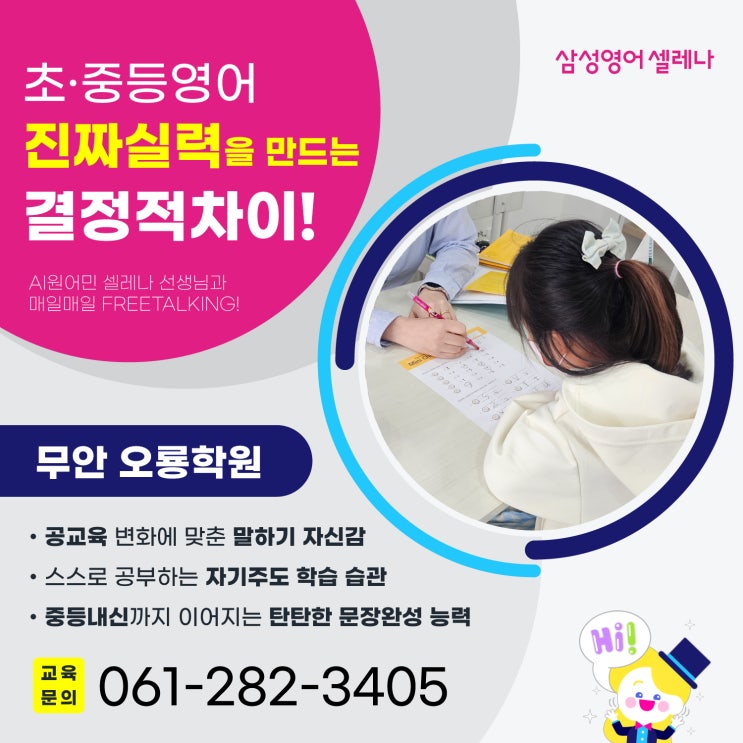 안녕하세요! 삼성영어셀레나20입니다. 전남 무안, 특히 교육열이 뜨거운 우리 오룡지역 학부모님들과 상담을 나누다 보면 공통적으로 하시는 고민이 있으신데요! "옆집 애는 벌써 원서 읽는다는데...", "우리 애는 학원만 왔다 갔다 하는 건 아닐까?" 하는 걱정을 하시는 경우가 많습니다. 초·중등 자녀를 둔 학부모님을 위하여 우리 아이들이 영어를 시작하거나 학습해 나가는 과정에서 중요한 포인트가 무엇인지, 왜 삼성영어셀레나가 그 해답이 될 수 있는지 잘 설명드리겠습니다. :) 초중등 영어전문 삼성영어셀레나 오룡학원은 오룡 우미린더시그니쳐 1차 맞은편 투썸플레이스 3층에 있습니다. ^^ 초 중등 영어, 진짜 실....... <img src="https://blogthumb.pstatic.net/MjAyNjA0MDNfMTA2/MDAxNzc1MTg1MTI3MDY3.JtvzaheIdGD77Nejr-gHqPZ0gVHiDI2qOW9Lg7a6Z1sg.YxPB5hCVEOhed-1Oj5qkBA4fMah3UeeN5KGBNKVD1vYg.JPEG/TITLE.jpg?type=s3" />