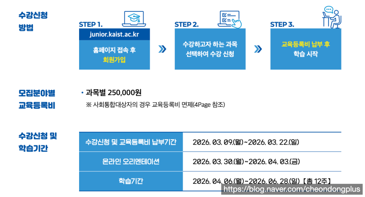 대덕연구단지 (現 대덕연구개발특구)가 있는 대전은 과학 특화 도시입니다. 대덕연구개발특구에는 정부출연연구기관 27개, 국공립연구기관 4개, 기타연구기관 8개, 대학 7개, 정부기관 10개, 공공기관 20개, 기타 비영리기관 27개, 기업 2,351개 등 2,454개 기관이 입주해 있어요. (2022년 현) 특히, 카이스트(KIAST)는 연구 중심 공대의 상징으로 학부시절부터 연구 참여 기회가 풍부합니다. 특히 과학과 수학을 사랑하는 친구들에게 반가운 소식입니다. 카이스트에서 초4학년부터 고2까지 참여가 가능한 과학, 수학 프로그램을 알려드릴게요. 주니어카이스트는 1999년 사이버영재교육을 시작으로 2025년도에 주니어카이스트로 개편했어요. 온라....... <img src="https://blogthumb.pstatic.net/MjAyNjAzMTJfMjAz/MDAxNzczMjgxODc3OTQ1.zr12khV8SOGdOVtKi5-Ouu53ExkVebIH56zx-HXM_70g.CE7LENpYPquhkuC-w2OI3IMC3JwLpwET0Iie22rSTZYg.PNG/%BD%BA%C5%A9%B8%B0%BC%A6_2026-03-11_%BF%C0%C8%C4_8.22.35.png?type=s3" />