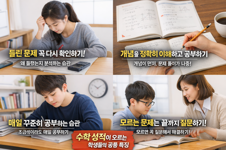 수학 성적이 오르는 학생들의 공통 특징 수학 성적은 단순히 문제를 많이 푼다고 해서 오르지 않습니다. 실제로 성적이 꾸준히 상승하는 학생들을 보면 몇 가지 공통된 학습 습관이 있습니다. 오늘은 수학 성적이 오르는 학생들의 특징을 알아보겠습니다. 1️⃣ 틀린 문제를 그냥 넘어가지 않는다 수학 성적이 오르는 학생들은 틀린 문제를 가장 중요하게 생각합니다. 문제를 틀렸다면 왜 틀렸는지 개념이 부족한지 계산 실수인지 문제 해석이 잘못된 것인지 이 과정을 반드시 확인합니다. 정답만 확인하고 넘어가는 학생과 틀린 이유를 분석하는 학생의 실력 차이는 시간이 지날수록 커지게 됩니다. 2️⃣ 개념을 정확하게 이해한다 성적이 오르....... <img src="https://blogthumb.pstatic.net/MjAyNjAzMTZfMTQ3/MDAxNzczNjYzMzg4NTA5.jNg4-ryXIFflhXmMgbY8RICf9HpX1JnqXEC4Hrf9VnQg.hz9mavJCRVLLE3YX8Nv0hhxSh1c-d4OTSec3gNxofVYg.PNG/%BC%F6%C7%D0_%BC%BA%C0%FB_%C7%E2%BB%F3%C0%C7_%B0%F8%BA%CE%B9%FD.png?type=s3" />