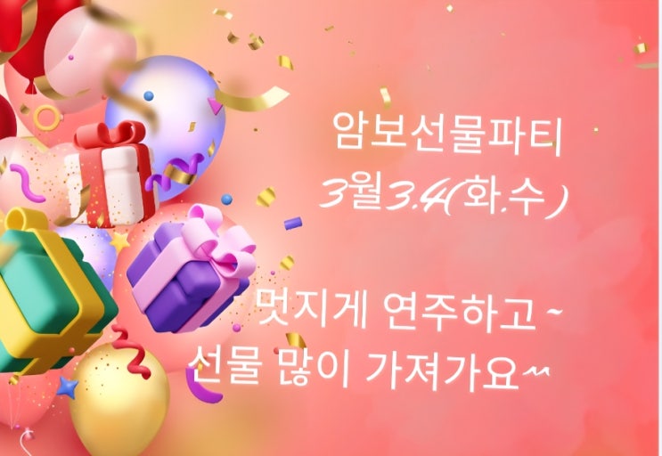 ✨ 두근두근! 피아노 암보 연주 & 선물 파티 소식 ✨ 파티는요…? 무조건 신나는 거 아시죠~~!! 우리 사랑이들이 한자리에 모여 피아노 암보 연주와 선물 파티를 준비했어요~!! 암보 연주의 좋은 점! ✔ 자신감 있는 피아노 연주 가능 ✔ 자존감 & 성취감 업! 업! ✔ 어디서든 버스킹 연주도 가능~ 요즘 버스킹 연주 정말 인기죠? 스스로 곡을 선택하고 멋지게 연주하는 자율적인 칸타레 사랑이들 정말 너무 멋지고 최고예요!! 무려 11년째 이어지고 있는 전통! 암보 연주 & 선물 파티는 우리 사랑이들에게 행복한 추억이 되는 시간이랍니다 그리고…....... <img src="https://blogthumb.pstatic.net/MjAyNjAzMDZfMTQy/MDAxNzcyNzMxMDYyOTQ3.CLQIuh6k10fa9PJDhRPa1UK_6_Tet-kzXX175fxiQ8og.4hxBV0ShojgBlFRuewB9Xi8gALPu9hiy5qEmT8bgm-0g.JPEG/900%A3%DFScreenshot%A3%DF20260226%A3%DF104810%A3%DFCanva.jpg?type=s3" />