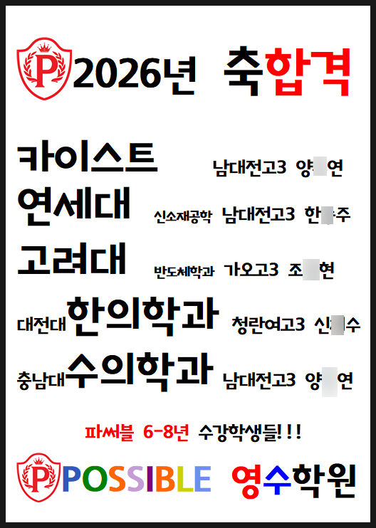 안녕하세요. Rahcle이예요. 이번 26년도에 정말 자랑스러운 파써블 학생들이 좋은 결실을 맺어서 같이 공유하려 합니다. 모두 꼬꼬맹이때부터 파써블 다녔던 친구들이라 정말 기쁜 마음 금치 못했어요. 최종 등록한 학교 쓴거구요. 중복합격도 많이 했더라구요. 정말 성실하게 공부하며 노력했던 친구들이었고, 솔직히 내신은 거의 1.0에 가깝다고 보시면 돼요. 전교 1-3등안에는 드는 학생들이었쬬. 그동안 노력한 만큼 좋은 결과를 받아든 우리 이쁜 친구들, 앞으로도 쭈욱 행복한 일들만 있기를 바랍니다!! <img src="https://blogthumb.pstatic.net/MjAyNjAxMjJfMTQy/MDAxNzY5MDY3MzkxNTg5.bDkZlnTdsGBAB6zLxo_I0_RZNgEn-X993qH1T7mTXigg.d0AOWMiqkZdIVCsfQUEubki9LDvAnRhmg_HzQXVTDLsg.PNG/26_%B4%EB%C0%D4%C3%E0%C7%D5%B0%DD.png?type=s3" />