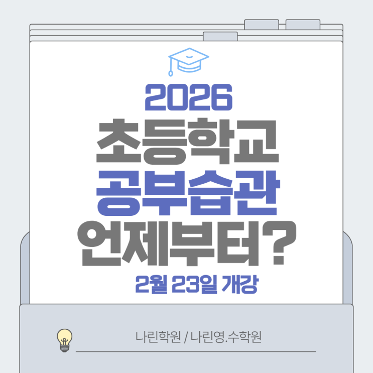 안녕하세요! [나린학원] [나린영.수학원] 입니다! 새학년의 시작이 성큼 다가왔습니다. 나린에도 이제 곧 새학년 개강이 찾아오는데요! 2월 23일 개강 개강을 앞둔 만큼 초등학교 공부습관은 언제부터, 어떻게 잡을지에 대해 소개해드리려 합니다! 초등학교 공부습관부터 새학기 시간표, 차량운행 등 초등부에 대한 여러 정보들이 있으니 꼭 필독 부탁드려요! 지금부터 초등 공부습관이 중요한 이유에 대해 알려드리겠습니다! - 공부습관을 잡아야 하는 이유 초등학생은 성적보다 '태도'가 만들어지는 시기입니다. 중.고등 가면 -> 공부 양은 늘어나는데 습관이 없는 아이는 버티기 힘듦 이떄 만든 습관은 평생 공부 방식의 기본 값....... <img src="https://blogthumb.pstatic.net/MjAyNjAxMjhfMjYy/MDAxNzY5NTg3NDU5MDYx.83pKB-GISx-POjUKHQyBlvFcFKyKs3JEhM6zUjoxirMg.Yc3a2xhTzRTb0GmRRDpdv-ML9o7YSfOFn2sOYOwix-Eg.PNG/%C1%A6%B8%F1%C0%BB_%C0%D4%B7%C2%C7%D8%C1%D6%BC%BC%BF%E4.-2.png?type=s3" />