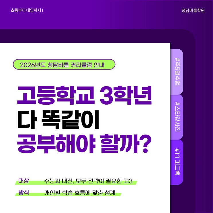 안녕하세요, 청담바름학원입니다 오늘은 2026학년도 고3을 기준으로 설계된 청담바름학원의 커리큘럼을 정리해서 안내드리려고 합니다. 고3 학습 은 단기간의 몰입만으로 완성되기보다는, 지금까지 해온 공부의 흐름을 점검하고 앞으로 남은 시간을 어떻게 이어갈지 정리하는 과정이 중요합니다. 또한, 고3은 수능과 내신을 동시에 고려해야 하고, 선택 과목에 따라 학습 방향도 달라지는 시기입니다. 그래서 ‘무엇을 더 할지’보다 무엇을 어떻게 정리해 가야 하는지가 중요해집니다. 청담바름학원은 고3 한 해를 무작정 버티는 시간이 아니라, 방향을 잃지 않고 끝까지 완주하는 과정으로 만들기 위해 고3 커리큘럼을 설계해 왔습니다. 청....... <img src="https://blogthumb.pstatic.net/MjAyNjAxMjlfMTg2/MDAxNzY5NjkwMzI5MzE2.kCOwESonhy6-OyFpqxq2RQU06UynmrH8FweaCpyr9B8g.1kEvMtIWlewj3DVWIvkFF8hdtw6npyeRbYsmhrNz-pog.JPEG/2026%B3%E2_%C3%BB%B4%E3%B9%D9%B8%A7%C7%D0%BF%F8_%B0%ED3_%C4%BF%B8%AE%C5%A7%B7%B3_page-0001.jpg?type=s3" />