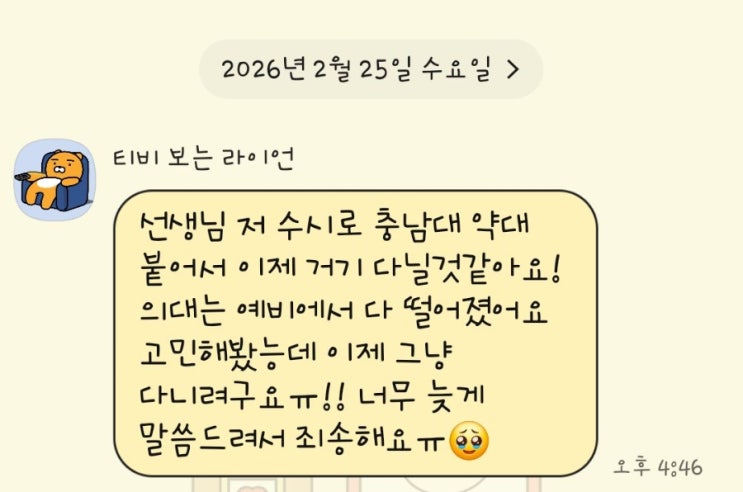 이 친구.... 내신이 참 좋은데 첫 해 떨어지고... 재수때.. 생명 실수 + 최저 미달로... 삼수 진행ㅋㅠㅠ 그런데 올해는 오오!! 들어왔어요!! ...진짜 올해는 되긋다!!했는데.... 연락이없어서요. 엄척 걱정했습니다. 연락도 못해보고 걱정은 되는데 걱정만 하고 있었죠. 그리고!!! 진짜 마지막에 연락왔어요 ㅎㅎ 통화해보니 의예 예비 3번이라 끝까지 기다렸는데 2번까지 빠졌데요. 그래도 더 안하고 최초합인 충대 약대 가기로 해서 ㅎㅎ 현역으로 붙은 친구와 서로 상견례 시켜주기로 했어요. 둘다 성격도 비슷해서 괜찮을거 같아요!! 더오름수학과학학원 042.535.0630 중등수학, 고등수학 중등과학/ 통합과학 /통합사회 물리 /화학/ 생명 /지....... <img src="https://blogthumb.pstatic.net/MjAyNjAyMjhfNjAg/MDAxNzcyMjA1MDk3NDU5.N1f1j5-uzSbmwgLGBqsDVYd_kWGx4B0Nq5tm6agmz-gg.0zh3iAC2tuGJGcSx7mNrPZcerq5mQb6QDRxAiRSYAfkg.JPEG/900%A3%DF1772199345414.jpg?type=s3" />