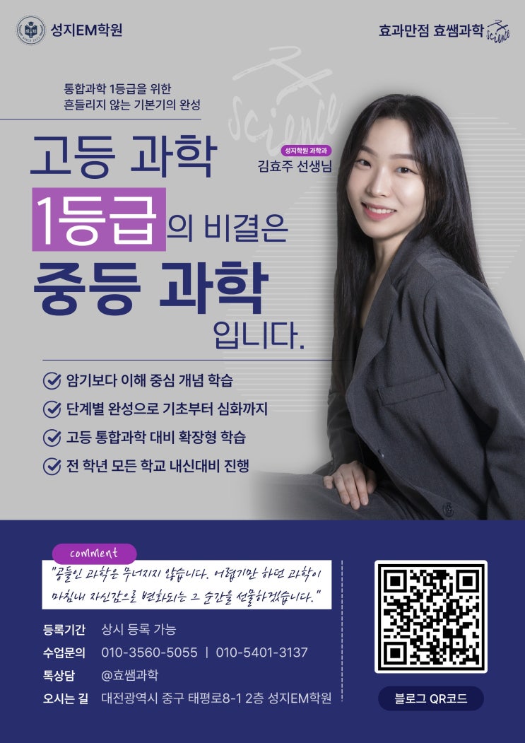 안녕하세요. 성지학원 효쌤과학 김효주T 입니다.^^ 추운 겨울이 지나가고 벌써 3월이 왔네요. 학원도 확장이전을 무사히 마쳤습니다. 아직은 일교차가 커서, 감기 걸리기 딱 좋습니다만....^^;; 그래도, 봄내음에 기분 좋은 하루들로 채워지는 3월 되시길 기원합니다. 오늘은, 3월 신학기를 맞이하여 많이들 고민하시는 주제 중 하나에 대해서 얘기보려고 하는데요. 꽤 긴 글이 되겠네요. 중학교 과학은 80점 이상의 점수는 무난하게 뜨고... 조금만 공부해도 90-100점 나오던데? 국영수에 치여 바쁜데, 과학을 굳이 학원까지 다녀야하나? 현장에서 아이들을 만나다 보면, 과학을 어려워하는 학생들이 대부분이긴 하지만, 또 적지 않은 학생들이....... <img src="https://blogthumb.pstatic.net/MjAyNjAzMDNfMzkg/MDAxNzcyNDg2MDI0OTAz._RCd8x7dKYvwSt8qxGomVORijkJ0pRopU5AwqjjbWskg.YUAkxKzXSRjpKvdcgxKhPQg_ixi7k9U8yt3yEcTETdcg.JPEG/%C8%BF%BD%DC%B0%FA%C7%D0_%B1%A4%B0%ED%C1%F6_%C2%F0%C3%D6%C1%BE.jpg?type=s3" />