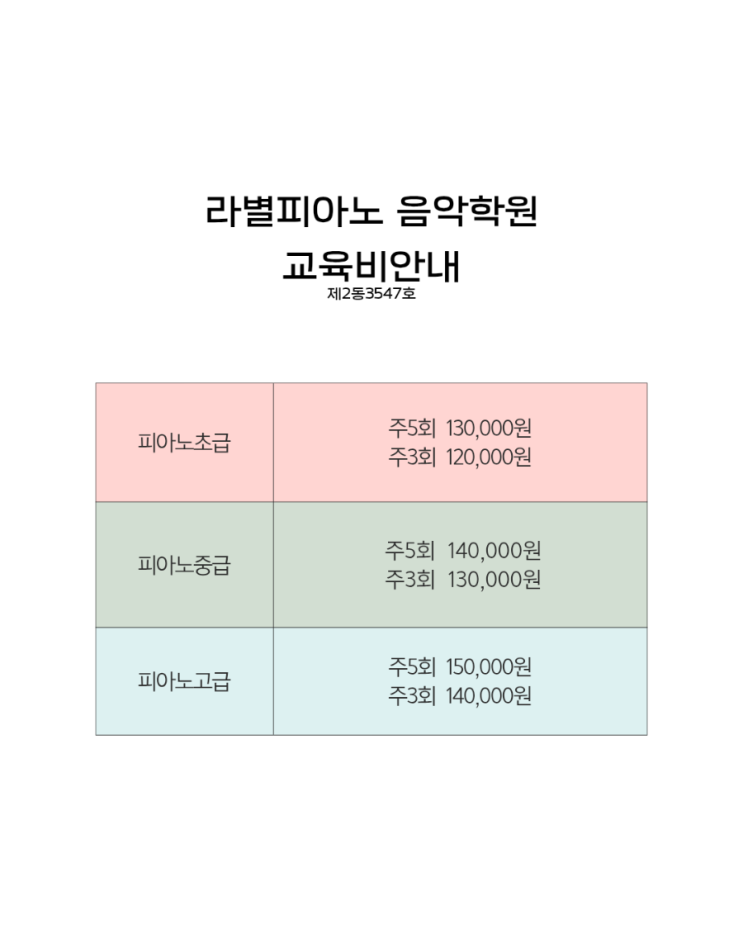 라별피아노음악학원 교육비안내