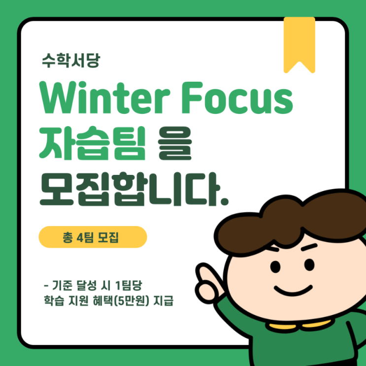 2026 겨울 방학을 알차게 보내기 위해 수학서당에서 준비한 특별한 프로그램! 을 소개합니다. Winter Focus 자습팀! Winter Focus 자습팀 모집 중 (이번 모집은 조기 마감 되었습니다.) 수료 시 1팀당 학습지원 혜택으로 5만원 지급! (WOW) 공부도 하고, 성취감도 얻는 1석 2조의 혜택! 방학 동안 집중해서 공부하고 싶은 친구들 모여요! ✔️ 총 4팀 모집 ✔️ 수료 시 학습장려금 지급 ✔️ 지원 기간이 짧아요! 2인 1팀 → 혼자면 흐트러지기 쉬운 방학, → 둘이서 서로 체크하며 끝까지 유지 ⏰ 주 20시간 × 5주 → 하루에 조금씩, 무리 없이 → 방학 동안 집중 루틴 완성 그대신 떠들거나 분위기를 흐리는....... <img src="https://blogthumb.pstatic.net/MjAyNjAxMjBfMjgw/MDAxNzY4ODgzODY1Mzgy.jqjbVCto74yn1melWWb_2RJyZ3kYOtMpuROT1WsSGxEg.X7bS3OcEWZdFDX7SYmJxam1SVECHu98fAk8Sollh070g.PNG/900%A3%DF1768883775538.png?type=s3" />