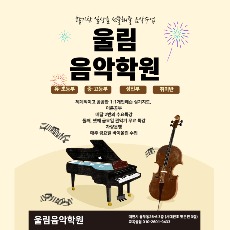 안녕하세요! 울림음악학원입니다. 저희 원은 차량운행 하고 있습니다. 또 바이올린 수업도 함께 열리고 있습니다.! 매주 금요일 성모초 방과후 강사 출신 선생님께서 열심히 아이들을 가르쳐 주고 계십니다.! 또 관악기 수업이 필요한 친구들을 위해서도! 금요특강도 준비되어 있습니다~~! 궁금하신 점 있으시면 언제든지 전화주세요! <img src="https://blogthumb.pstatic.net/MjAyNjAxMjFfMjMy/MDAxNzY4OTYwNDE4MDAz.wQCWdp9c9meSVMQGQbkj3_4acPuHqW-xeKMmUyerRKgg.o8EXgHw0G1JIqflPOWvSeDjYvluzljeTrvTda7tWATUg.PNG/%C0%FC%B4%DC%C1%F6.png?type=s3" />