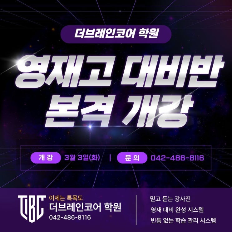 안녕하세요? 더브레인코어 대표 홍민호입니다. 얼마전에 설명회에 많은 분들이 참석해 주셨습니다. 사정상 못 오신 분들을 위하여 한번 더 올리도록 하겠습니다. 항상 실적을 내는 학원 더브레인코어입니다. 3월3일부터 시작하는 영재대비반 시간표입니다. 신뢰가 가는 실적이 나올 수 밖에 없는 강사진은 다음과 같습니다. 결과는 만들어 본 사람이 또 만듭니다. 어찌하다보니어벤져스급 드림팀이 완성되었습니다. 대전 특목 전성기를 이끌던 8명중 5명이상이 뭉쳤습니다. 많은 관심 부탁드립니다. 영재고 대비도 더브레인코어가 하면 다릅니다. 영재 대비반 수업 신청서 항상 감사드립니다. 상담은 언제나 열려있으니 문의 주세요. <img src="https://blogthumb.pstatic.net/MjAyNjAzMDJfMTU4/MDAxNzcyNDYyMDg1Nzk1.CC-mfqwARllipUxCAv2bAUDRitize5vaS40crPqXVTkg.OW1Ws9x8kXLjne8xPtFGheQa5rQxZB0BYjUBTqieDqcg.JPEG/KakaoTalk_20260302_200017676.jpg?type=s3" />