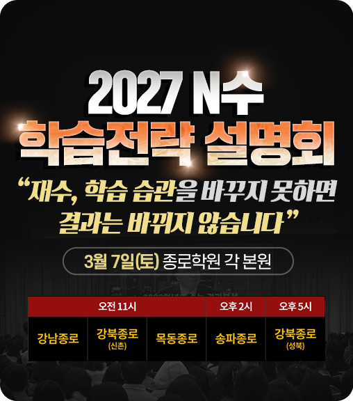 안녕하세요! 종로지기 입니다~! 2027 학습전략 설명회를 개최 합니다! " 재수, 학습 습관을 바꾸지 못하면 결과는 바뀌지 않습니다." ============================================================================= ■....... <img src="https://blogthumb.pstatic.net/MjAyNjAzMDRfMjAx/MDAxNzcyNjE1NTE3ODg3.ljrrZKJjIXYZv_ybq7GwlT28YX5KKeU0rqWXdi_pBS8g.zBB5tJpa7VxukYzXR_0zqhzBuEzbnSQi1yVUiPg3i80g.JPEG/img260307exr.jpg?type=s3" />