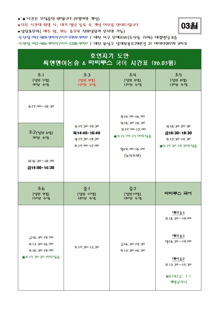 3월 씨앤에이논술 & 파피루스 국어 시간표 (도안 · 둔산) #신규반안내 [호연지기 국어·논술 │ 3월 시간표 안내] 신학기 시작과 함께 씨앤에이논술 & 파피루스 국어 3월 시간표를 안내드립니다. ⚠️ 필독 안내 ✔ ★ 표시 시간대: 현재 모집 중 (4명 이상 시 개설) ✔ 다른 시간 희망 시: 대기 등록 후 개설 여부 개별 안내 ✔ 월·화 휴무 (전화·문자 상담 가능) 교육 상담 및 문의 ▪ 둔산점 042-489-9050 / 010-5959-9050 ▪ 도안점 042-486-9050 / 010-3288-9050 <img src="https://blogthumb.pstatic.net/MjAyNjAyMTlfMjk3/MDAxNzcxNTA5MTc3Mzk2.AjGzHw9qB72wFKtCWblegpC2pY39fhkKu_K7XxHjuxUg.CfOQUZ0sfvVKf9n6f94PUp8UCBWAkccubg_myw3u_Aog.JPEG/KakaoTalk_20260219_223415291.jpg?type=s3" />