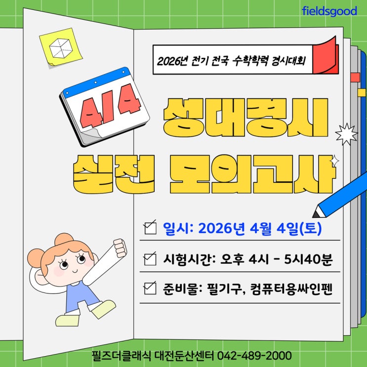 <재원생을 위한 2026년 전기 전국 수학학력 경시대회 실전모의고사 > 안녕하세요 심화사고력수학 필즈더클래식 둔산센터입니다. 우리 아이의 수학적 실력을 가장 객관적으로 평가받을 수 있는 시험인 <2026년 전기 전국 수학학력 경시대회 (구-성대경시)>가 오는 4월 5일(일) 1시에 시행됩니다. 필즈더클래식 둔산센터에서는 이를 대비하기 위해 재원생들을 위한 <성대경시 실전모의고사>를 경시 하루 전 날인 4/4일(토) 오후 4시-5시40분에 준비했답니다. < 전국 수학학력 경시대회 >는 타 경시대회보다도 난이도 높은 수학문제 및 창의력과 사고력을 요하는 다양한 유형의 문제가 출제되는만큼 수학 성취도가 높은 학....... <img src="https://blogthumb.pstatic.net/MjAyNjAzMDlfNTgg/MDAxNzczMDU2NTMwNDg3.IA2mF26F1q-gA9ft6kb7GpHn8IYwLYytNld9NWdKqX0g.gU9pcSR-8mXcv3Y2cdibSAmAEqXcVN1ImGOCC4OoiOQg.JPEG/%BC%BA%B4%EB%B8%F0%C0%C7%B0%ED%BB%E7_1.jpg?type=s3" />