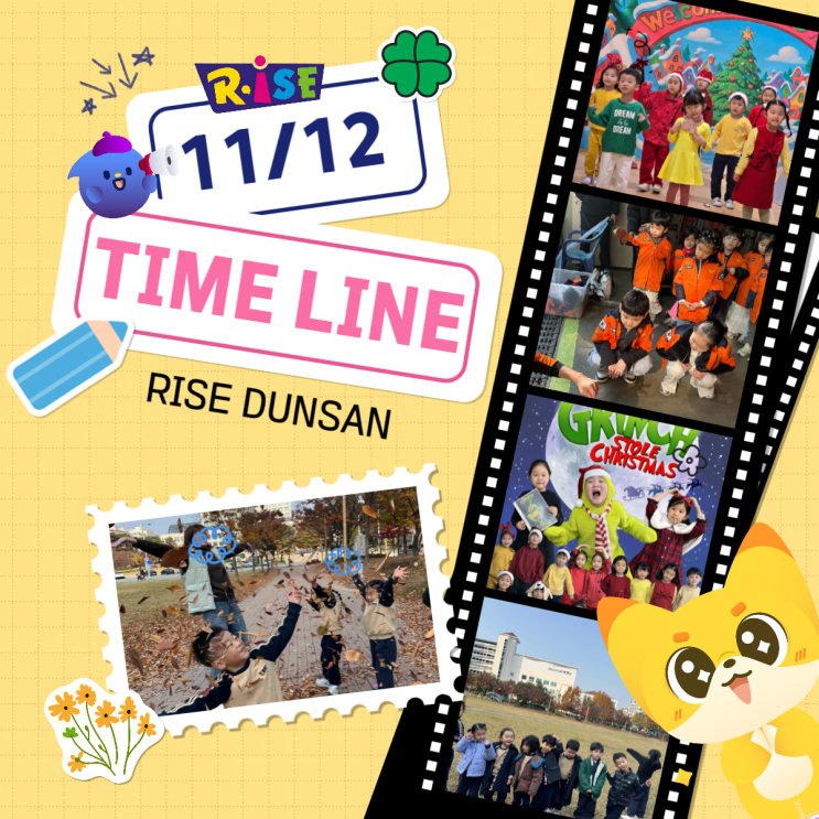 Rise Dunsan 11월·12월 타임라인이 업로드되었습니다 이벤트가 정말 많았던 날들이었어요 ~ 가을을 느끼기 위한 산책도 하고 아이들의 안전을 지키기 위한 Safety Class도 진행하고 그리고 가장 큰 이벤트였던 Christmas Performance부터 Real Santa Claus를 만났던 특별한 하루까지! 11월부터 12월의 마지막 순간까지 하루하루를 알차고 즐겁게 보낸 우리 라이즈둔산 아이들 사진만 봐도 행복함이 그대로 느껴지지 않나요? ✨ So many memories, so much joy. 2026년인 올해도 아이들과 함께할 happy & meaningful days가 벌써부터 기대됩니다 2026년도에도 라이즈둔산에서 함께할 친구들을 모집....... <img src="https://blogthumb.pstatic.net/MjAyNjAxMjBfMTEw/MDAxNzY4ODg2ODMzNzE5.ut-WdjcoZYWmJZMQl5SIvFuH57Xr0fJLe6UaFH6Uvvsg.bScBmRMTId6tnxrVluHVkPFRvMn8KaThSOWzqB3R_Mgg.PNG/001.png?type=s3" />