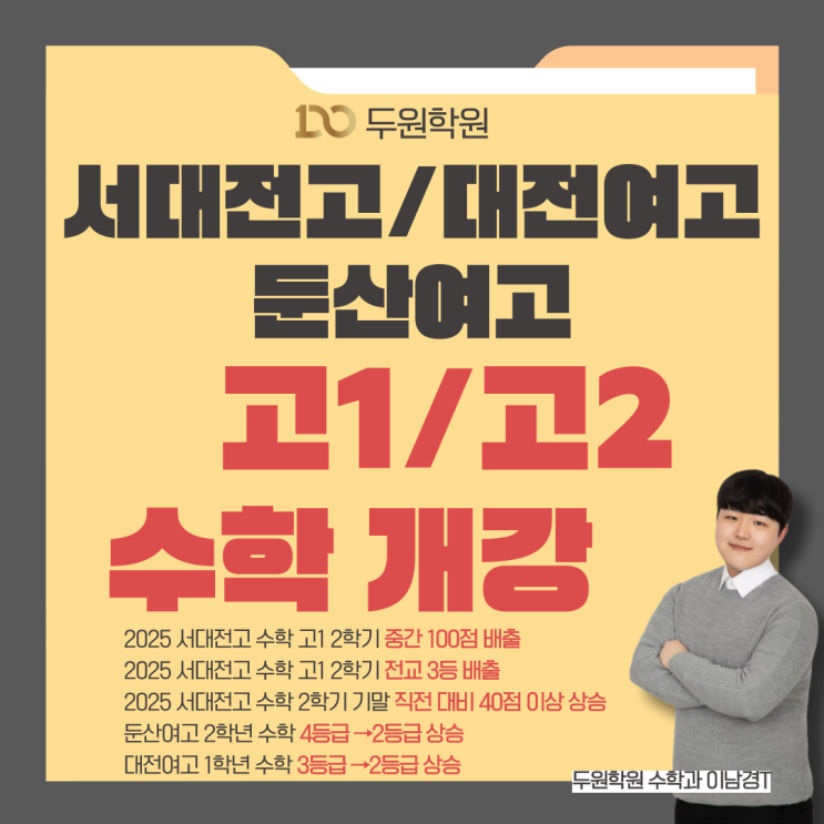 서대전고 · 대전여고 · 둔산여고 고1 / 고2 수학 개강 안내 꼼꼼한 관리 · 세심한 지도 두원학원 수학과 이남경입니다. 지난 학기 결과로 증명했습니다. ✔ 2025 서대전고 고1 2학기 중간 100점 배출 ✔ 2025 서대전고 고1 2학기 전교 3등 배출 ✔ 2025 서대전고 수학 2학기 기말 직전 대비 40점 이상 상승 ✔둔산여고 2학년 수학 4등급 → 2등급 ✔대전여고 1학년 수학 3등급 → 2등급 단순 문제풀이가 아닌 개념 완성 → 유형 정리 → 학교별 서술 대비 → 실전 모의 테스트까지 학교 시험에 정확히 맞춘 수업을 진행합니다. 시청역5번출구 타임문고 뒤 동림빌딩 6층 상담문의 042.484.2121/010.5521.2170 <img src="https://blogthumb.pstatic.net/MjAyNjAyMjdfMyAg/MDAxNzcyMTcyMzUyODYz.e4CA4i06Cu-3hEars4TpHkbquTHIJaQCuepf-mHIaQ0g.eh5GqT0e7vfFz3w_rR83nWtpHHg0Bt73hWbyy-LkeVkg.PNG/%C1%A6%B8%F1%C0%BB-%C0%D4%B7%C2%C7%D8%C1%D6%BC%BC%BF%E4_-001.png?type=s3" />