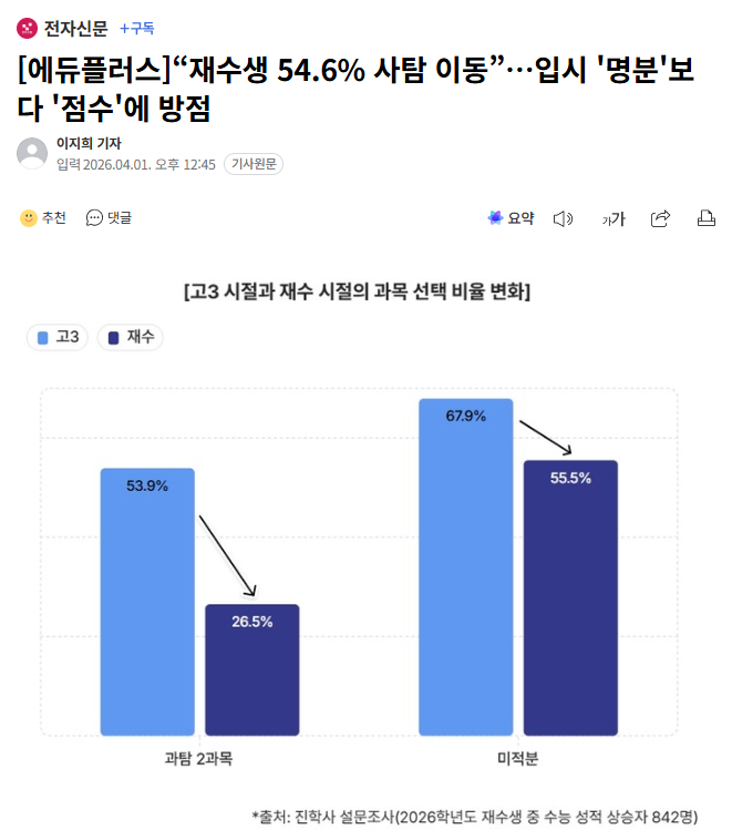 재수를 해서 성적을 올린 선배들의 비결은 무엇일까요? 조사 결과, 많은 재수생이 전공과 관련된 과목을 고집하기보다 '점수를 따기 쉬운 과목'으로 과감하게 옮기는 실리적인 선택을 한 것으로 나타났습니다. 입시 플랫폼 진학사가 성적이 오른 재수생 842명을 조사한 결과, 고3 때 과학탐구(과탐)를 공부했던 학생 중 54.6%가 재수를 시작하며 사회탐구(사탐)가 포함된 조합으로 갈아탔습니다. 특히 과탐 2과목을 하던 학생 중 상당수가 사탐으로 완전히 전환하거나, 사탐과 과탐을 섞어서 공부하는 방식을 택했습니다. 이러한 현상은 수학에서도 뚜렷하게 나타났습니다. 미적분 선택 감소: 고3 때 67.9%였던 미적분 선택 비율이 재....... <img src="https://blogthumb.pstatic.net/MjAyNjA0MDFfMTE2/MDAxNzc1MDMxMDcyMTM3.PHWG8HjwSx_eK7yus6PDkR7jVtqai61ZMMqkKwG06AYg.5g_PE-6_RykE3BENAPbh_hyVvEHSfUnZJ54_ZpuxD6gg.PNG/image.png?type=s3" />