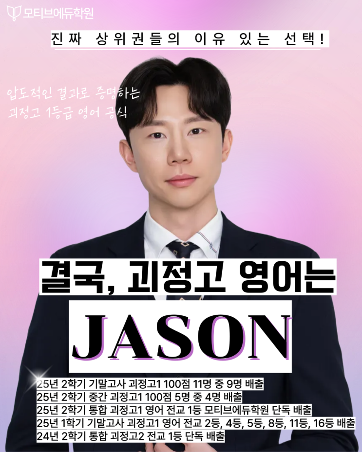 [제 서 1471호] 둔산동 국어 / 영어 / 수학 / 과학 / 사회 상위권이 선택한 내신&수능 전문 모티브에듀학원 안녕하세요 모티브에듀학원입니다:) 오늘은 진짜 상위권들의 이유있는 선택, 괴정고등학교 국어, 영어 내신반을 소개해 드리려고 합니다. 괴정고 전교 1등, 상위권 학생들이 많이 다니는 데에는 이유가 있는 법이죠. 길게 말로 하지 않겠습니다. 결과로, 성과로 보여드리겠습니다. 가히 전교 1등은 우연이 아니고, 한 번이 아니라 매 학기 만들어내는 힘이라는 것을 직접 느껴보시길 바랍니다. 2025년 괴정고1 국어/영어 전교 1등 모티브에듀 재원생 매 시험마다 100점 / 1등급 다수 배출 <괴정고 국어 성과> -4년 연속 전교 1....... <img src="https://blogthumb.pstatic.net/MjAyNjAzMjlfMjMw/MDAxNzc0NzczMDY4OTIx.zAQc2KdJ1M1F6BodWrp5hssx0aktR1F4M7D_imv4JuEg.Pdu-FxJGAYv84apWFjrGPnJ8nYI1knLla29DaQCQRlEg.PNG/001.png?type=s3" />