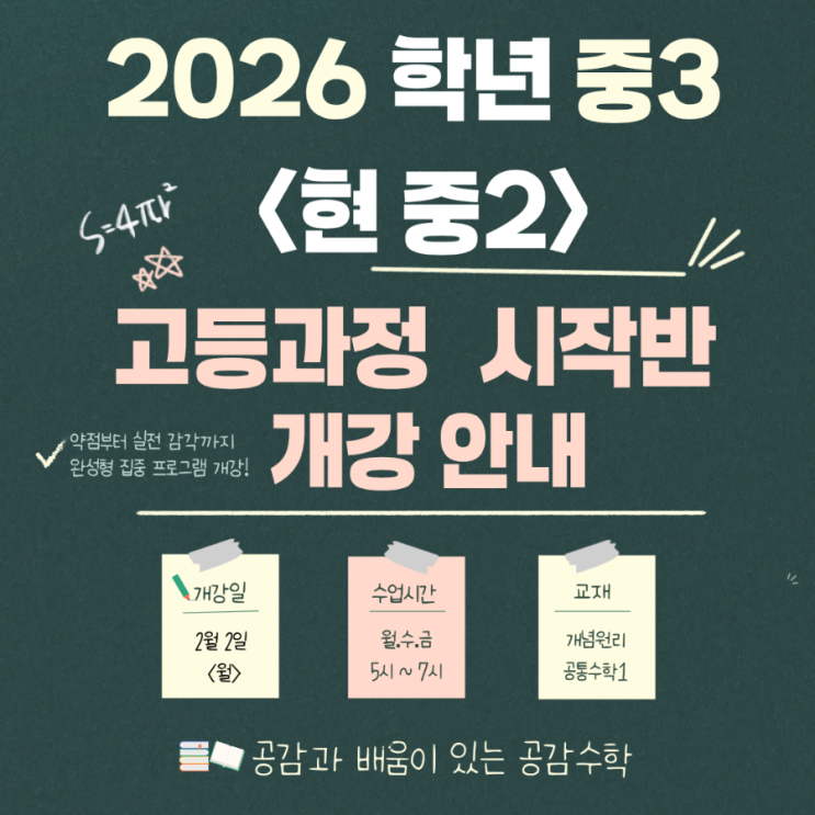 중요한 것은 진짜 아는것 !!! 안녕하세요^^ 공감과 배움이 있는 공감수학 입니다. 예비중3 (현 중2) 학생들의 과정이 개념에 이어 심화 진행중에 있어 차후 2월2일 개강 하게될 고등과정 안내드립니다!! 개강일 2월2일 [월요일] 수업시간 월.수.금 5시~ 7시 ☆3월부터 수업시간 변경됩니다.☆ 교재 개념원리 공통수학 1 개강일 2월2일 <월요일> 정원 <6명> 현재 4명의 학생들이 수업중 이며 2명 추가모집 합니다. 공감이 있고 배움이 있고 진짜 수학이 있는 공감수학 에서 고등과정을 함께 시작하게 될 예비중3 친구들의 관심과 문의 부탁드릴께요^^ 공감과 배움이 있는 공감수학 교육문의 : 010-3312-0982 <img src="https://blogthumb.pstatic.net/MjAyNjAxMTZfMTIx/MDAxNzY4NTU2NjAwNDc2.k1wse__0pAmbOpnT2eYQQiRhKks7Qy_3_SD6hU65l14g.v_tu5EyqL0wbhdM_5wOkJn8IQgRWd6RW493BSVBemT8g.PNG/900%A3%DF1768556590500.png?type=s3" />