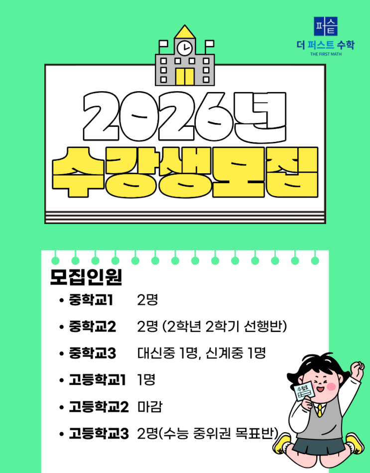 안녕하세요. 더퍼스트수학교습소에서 2026년 수강생을 모집합니다. - 중학교 1학년: 2명 - 중학교 2학년: 2명(2학년 2학기 선행반) - 중학교3학년: 대신중 1명, 신계중 1명 - 고등학교 1학년: 1명 - 고등학교 2학년: 마감 - 고등학교 3학년: 2명(수능 중위권 목표반) 저희 더퍼스트수학의 장점은 소수그룹 지도에 있으며, 다음과 같은 효과가 있습니다. 1. 개별 맞춤 지도 가능합니다. 학생 수가 적어 개인의 수준·취약점·학습 속도를 원장이 지도하여 직접 정확히 파악할 수 있고, 같은 단원이라도 학생별로 난이도를 조절하며 개념을 설명합니다. 2. 질문·피드백을 즉각적으로 피드백합니다. 중하위권 학생들은 자신이 모르는 것에 대해 질문하....... <img src="https://blogthumb.pstatic.net/MjAyNjAxMThfOTcg/MDAxNzY4NzMzNTIxODU5.0Ua0DYFitDzyAU8s1WFAaq3yzkngd-4W9_IQUqJHDKog.MXQ6P8tZL-ZZuBjC4eQVY9OD6fUt2qrG_ONuq952i70g.PNG/2026_%BC%F6%B0%AD%BB%FD%B8%F0%C1%FD.png?type=s3" />