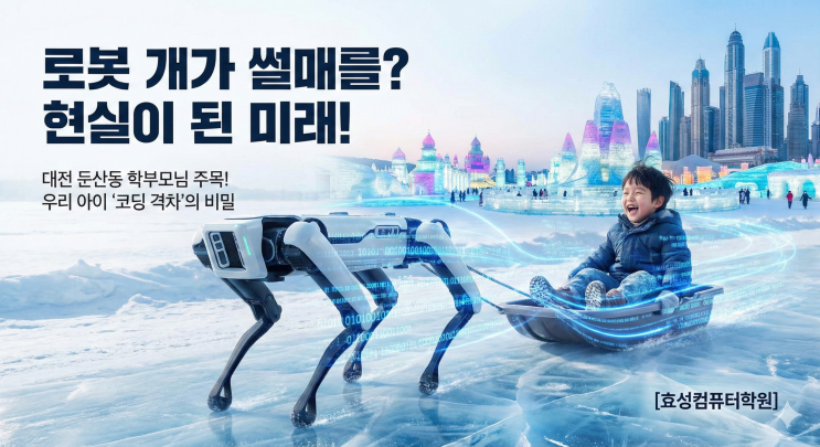 안녕하세요! 대전 둔산동 학부모님들의 교육 나침반, 효성컴퓨터학원입니다! 갑자기 추워진 날씨에 우리 아이들 감기 걸리지는 않았을까 걱정되는 요즘입니다. 오늘은 어머님들의 눈을 번쩍 뜨이게 할 흥미로운 사진 한 장과 함께 미래 교육 이야기를 나눠보려 해요. 오늘의 뉴스, 핵심만 쏙! 바쁘신 어머님들을 위해 딱 3가지로 요약했어요. ✔️ 첫 번째: 최근 중국 하얼빈에서 '로봇 개'가 끄는 썰매를 타는 어린이의 모습이 포착되었습니다. ✔️ 두 번째: 전시용 로봇이 아니라, 빙판 위에서 정교하게 균형을 잡으며 썰매를 끄는 높은 수준의 기술력입니다. ✔️ 세 번째: 로봇과 인간이 공존하는 시대가 예상보다 훨씬....... <img src="https://blogthumb.pstatic.net/MjAyNjAxMTRfMTI5/MDAxNzY4Mzg4ODU2Njkz.nCA8BZ_Oh1Bc71W79y7GWMEWqLL3HlPTbmYvXG7INA0g.jI97IQNZIq-LgCSahAOSo1JNH46HJCk7GNxUQ3wQCYgg.PNG/Gemini_Generated_Image_kk29h4kk29h4kk29.png?type=s3" />