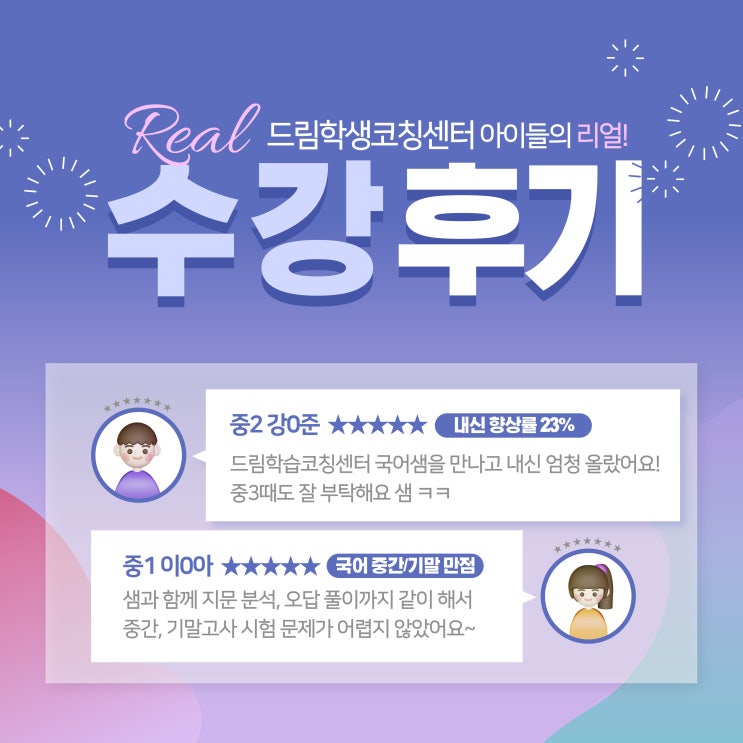안녕하세요^^ 드림학습코칭센터입니다! 오늘은 드림학습코칭센터에서 열심히 학습하고 있는 아이들의 따뜻하고 생생한 실제 수강 후기를 소개해 드리려고 합니다! "우리 아이들이 직접 전하는 드림학습코칭센터 수강 후기, 함께 들어보실래요?" 아이들이 직접 말하는 학원 이야기 "처음에는 공부가 재미없었는데, 특별활동도 하면서 수업이 재밌어졌어요. 친구들이랑 같이 퀴즈도 풀고 발표도 하니까 말하기에 자신감이 생겼어요!" (초등학생 수강 후기) "국어가 싫고 어려웠는데, 선생님을 만나고 내용에 대한 이해가 잘 됐어요. 선생님이 강조하신 내용이 시험 문제에 많이 나와서 국어 점수가 올랐....... <img src="https://blogthumb.pstatic.net/MjAyNjAxMTVfMTc2/MDAxNzY4NDU3NTE2MDgx.nWZVQu1kne___LYI2cgfaz5tsXxsVCvZyB_Xrrlhc5Ag.3x8-YCSsDw1yYjq5C_HnCCnKOGJuKc0yzEB1tFa5Zswg.JPEG/%BC%F6%B0%AD.jpg?type=s3" />