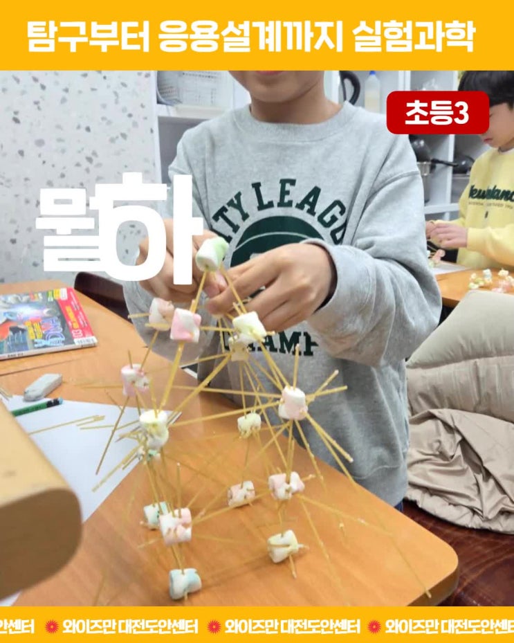 자기주도적 탐구부터 응용설계까지 창의적 문제해결력을 올리는 와이즈만의 실험과학 수업 입니다. 초등부 3학년 무게중심과 분산을 활용하여 " 머쉬멜로우와 스파게티로 가장 튼튼한 탑을 쌓아라!! " 아이들이 서로 다른 모양으로 아이디어를 내고 미션을 해결하고 있어요 <img src="https://phinf.pstatic.net/image.nmv/blog_2026_02_04_433/4yQdeIGAVT_01.jpg?type=f480x480" />
