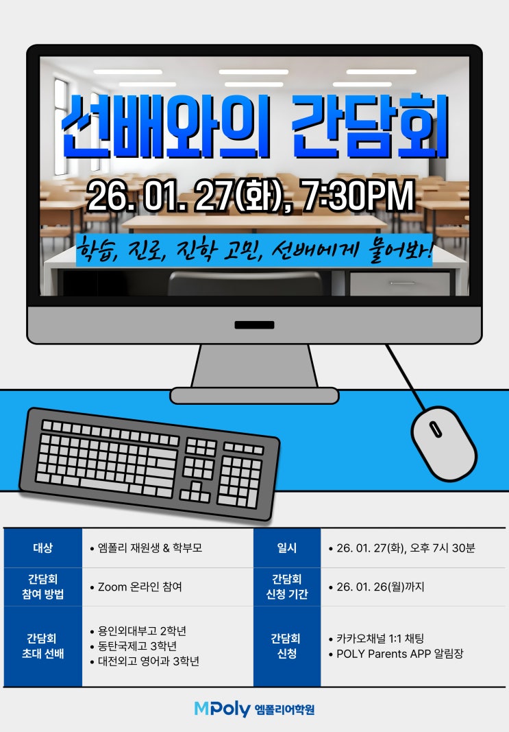 안녕하세요! 오는 1월 27일(화), 엠폴리 재원생들의 학습 의욕을 북돋우기 위한 ‘선배와의 간담회’를 진행합니다. 많은 분이 함께하실 수 있도록 온라인으로 진행되오니, 학생과 학부모님의 많은 관심 부탁드립니다. 1. 간담회 일시 - 26년 1월 27일(화), 오후 7시 30분 2. 간담회 신청 방법 1) 카카오채널 1:1 채팅 2) POLY Parents APP 알림장 3. 간담회 참여 대상 - 엠폴리 재원생 & 학부모 4. 간담회 참여 방법 - Zoom 온라인 참여 5. 간담회 초대 졸업생 1) 용인외대부고 2학년 2) 동탄국제고 3학년 3) 대전외고 영어과 3학년 감사합니다. <img src="https://blogthumb.pstatic.net/MjAyNjAxMDVfMTY1/MDAxNzY3NjA0Mjk4NDc2.eDQ3uIwbbmYSLYHpqUK0BAOJLepAi5QmA41cnb6e5qUg.wYpPgdQZBa-F9ZIGx941s3N2fsveKv4XAHbBi-4ee94g.JPEG/%BC%B1%B9%E8%BF%CD%C0%C7%B0%A3%B4%E3%C8%B8-002.jpg?type=s3" />