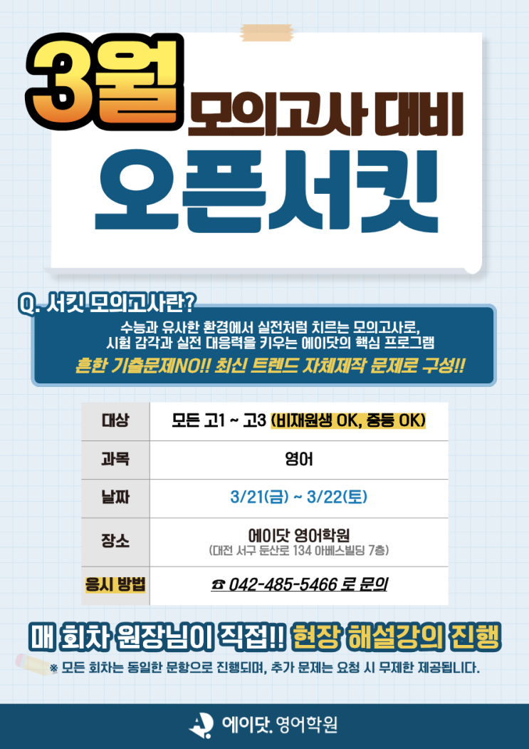 안녕하세요 에이닷 영어학원 대전서구점입니다. 벌써 다음 주면 3월 모의고사가 다가왔습니다. 새 학년이 되고 처음 치르는 시험이라 많이 긴장되시죠? 그래서 저희 에이닷 서구점에서는 3월 모의고사를 대비해 **“오픈 서킷”**을 진행합니다! 서킷 모의고사란? 에이닷에서는 매주 자체 제작 모의고사인 **‘서킷 모의고사’**를 통해 뻔한 기출 문제만 돌리는 것이 아닌, 다양한 출제 지문 패턴에 대응하는 "CIRCUIT(순환)"하는 모의고사를 통해 보다 실전에 가까운 문제를 풀어보며, 시험 또한 듣기부터 시작해 실제 수능장과 유사한 환경에서 시험을 보며 영어 독해 감각을 유지하고, 실전 대응력을 키우는 프로그램입....... <img src="https://blogthumb.pstatic.net/MjAyNjAzMTdfMjE1/MDAxNzczNzUwNzI5NzY5.ukNJYiYfS2tRCGvjdw1vXzwj411BXlpm5BcNhitA5Gog.2XtM2z9hMkvzYD3uaKUp9_aXxNmiu9MjzfpgR1B5YdIg.PNG/%BF%C0%C7%C2%BC%AD%C5%B6.png?type=s3" />