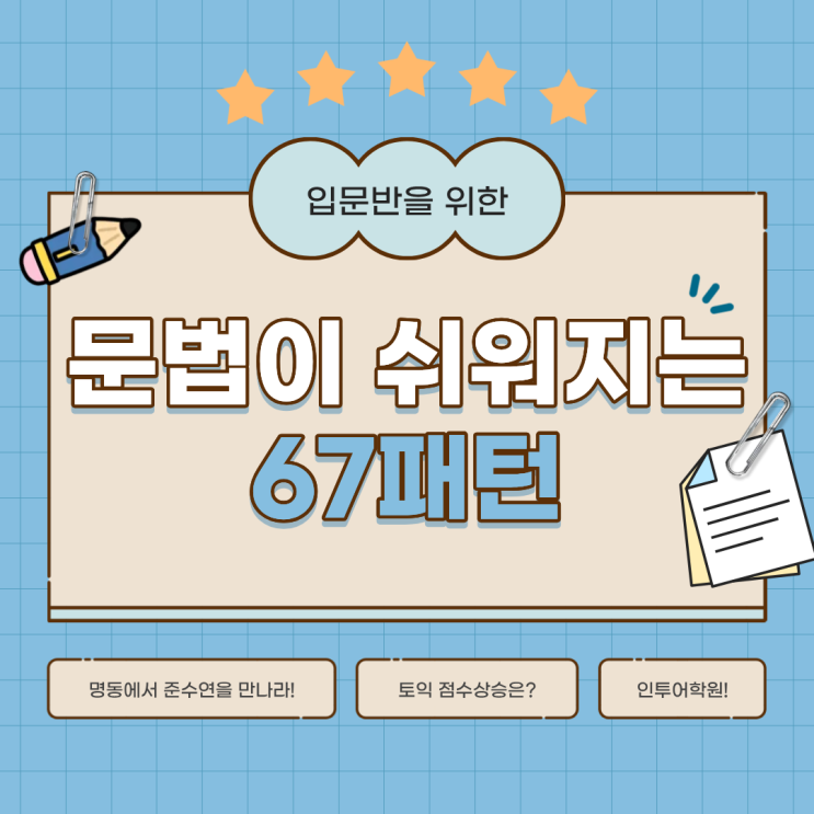 [대전 토익 입문] 문법은 암기가 아니라 패턴이다! 인투어학원 67패턴 ‘명사마을’로 토익 문법 끝내기! "영어를 잘하려면요?" "명동(명사, 동사 마을)에 가서, 준수연(준동사/수식어/연결어)을 만나세요!" 대전 토익 입문자와 기초가 부족한 분들을 위해, 인투어학원만의 67패턴 시스템 중 '준동사마을' 콘텐츠를 블로그에서 공개합니다! 영어를 잘하려면? 명동에 가서 준수연을 만나면 됩니다. 오늘은 연결어마을에 전치사 집을 방문해 보겠습니다. 1. 전치사 확장 정리표 (문맥의도 중심) 2. 비슷한 전치사 비교 포인트 3. 자주 혼동되는 전치사 비교 4. 동사와 전치사 연결 포인트 5. 실전 적용 문제 예시 Q........ <img src="https://blogthumb.pstatic.net/MjAyNjAyMjBfMjMy/MDAxNzcxNTQ4Mzk0NTM1.L7BkMBPCkqy1YSyyLIEK9rwMTrZeHlXi_zFX4_55Idcg.T1pedrUK-m1yfeaaGXipTd0h8VK3hqocWP3blOoDESwg.PNG/%3F%A0%9C%EB%AA%A9%EC%9D%84_%3F%9E%85%3F%A0%A5%3F%95%B4%EC%A3%BC%EC%84%B8%3F%9A%94..png?type=s3" />